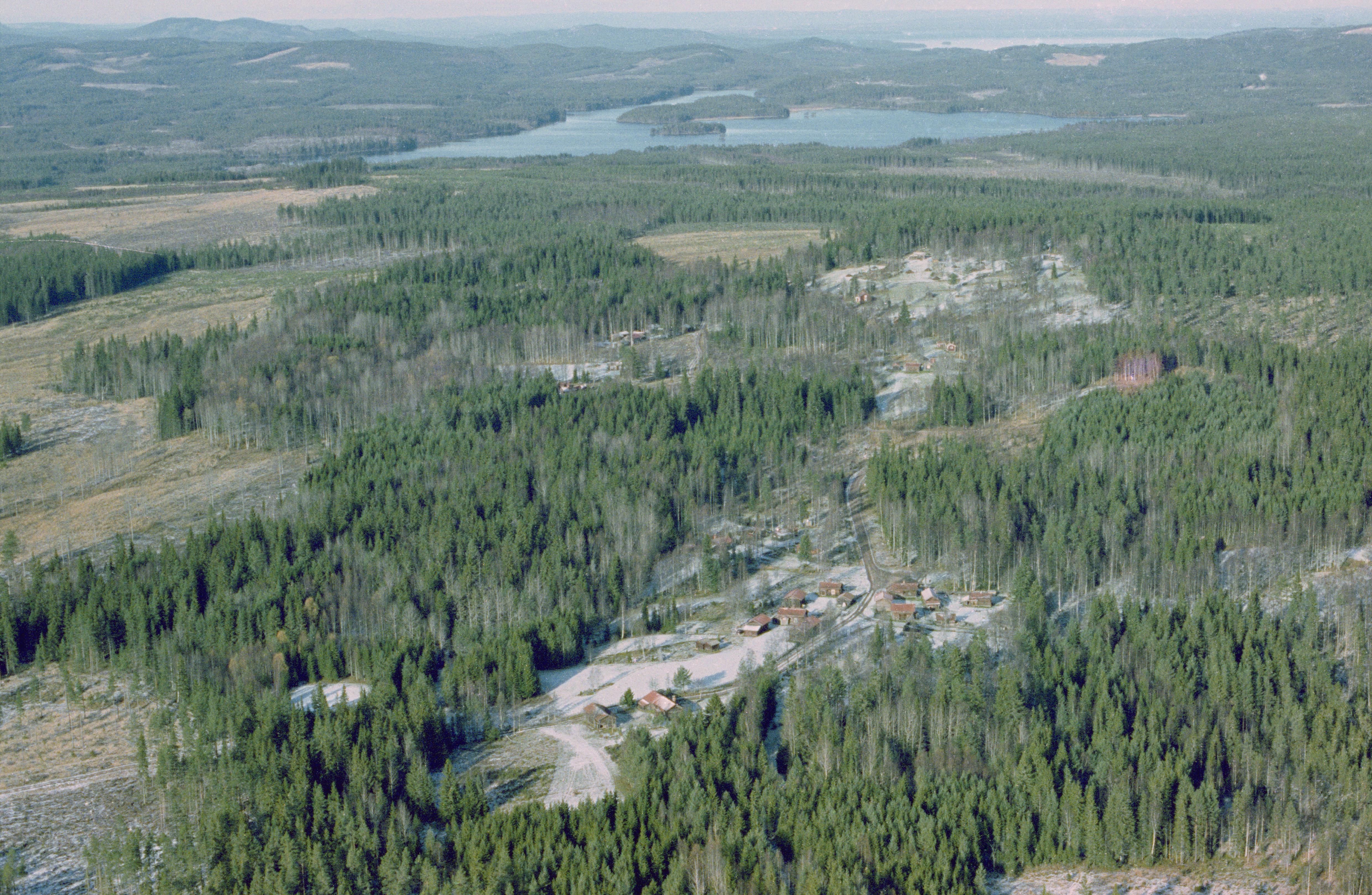 Beskrivning: Fäbodsbyn Ljusbodarna med fäbodarna RAÄnr Leksand 513:1-8. Fäbod RAÄnr Leksand 513:8 till vänster under bildens mitt. Vandringsvägen Romboleden mot Skinnaråsen till höger i bildens nedre del. Sjön Ejen i bildens övre del. Bilden är tagen mot (väderstreck): N