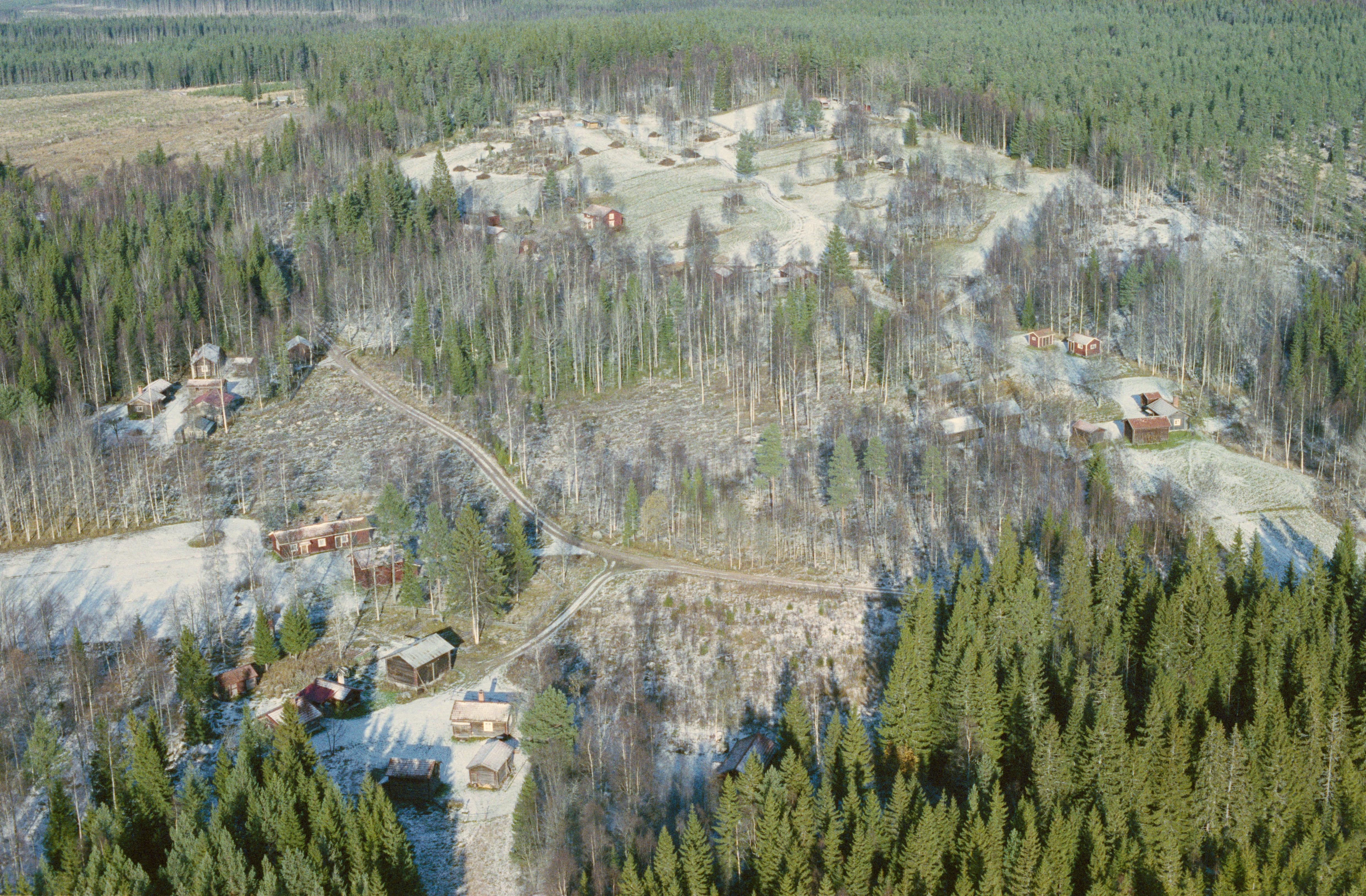 Beskrivning: Fäbodsbyn Ljusbodarna med fäbodarna RAÄnr Leksand 513:1-8. Fäbodarna RAÄnr Leksand 513:2 och 513:5 vid bildens mitt. Vandringsvägen Romboleden mot Skinnaråsen till höger. Bilden är tagen mot (väderstreck): NNO