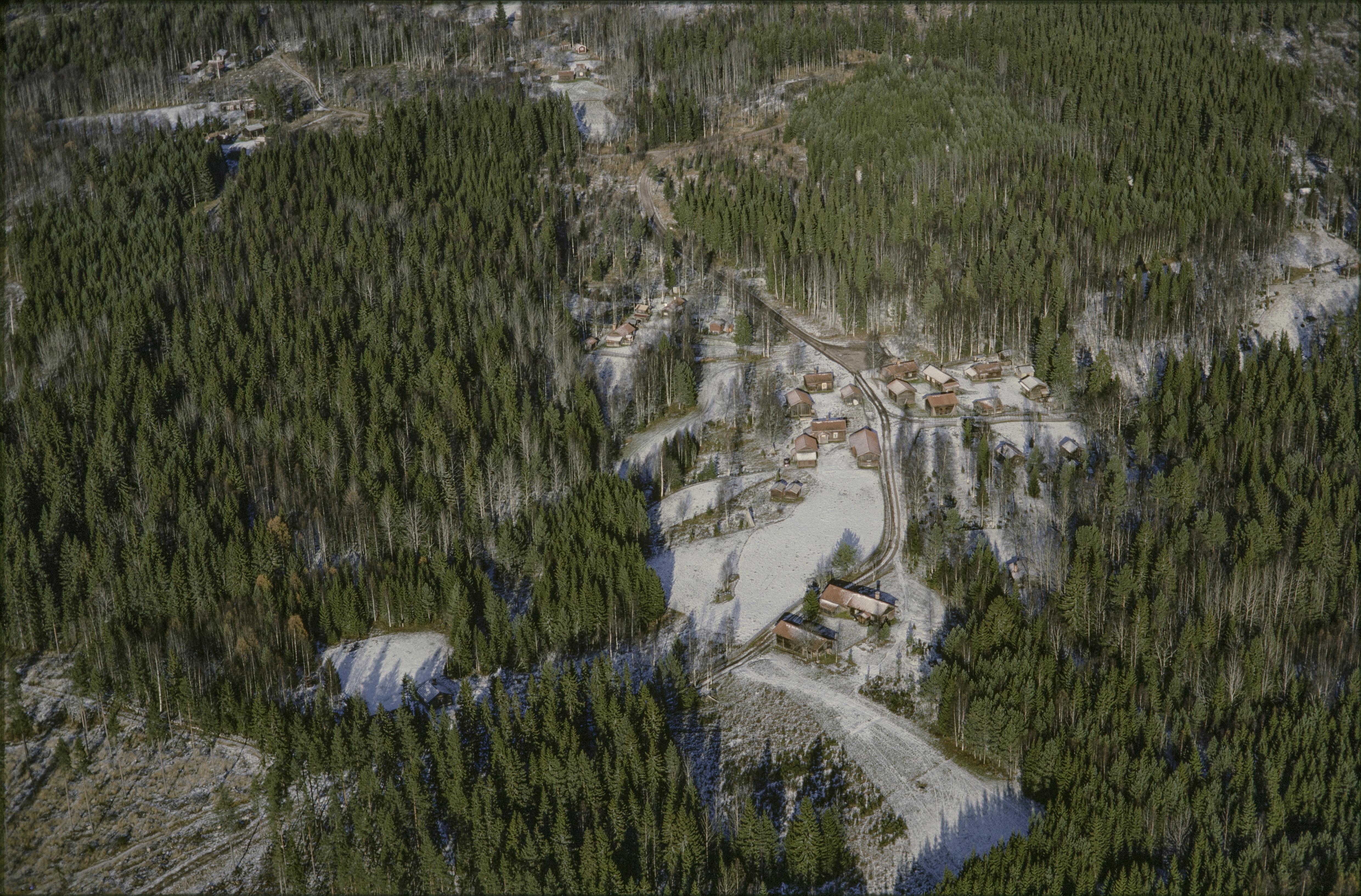 Beskrivning: Fäbodsbyn Ljusbodarna med fäbodarna RAÄnr Leksand 513:1-8. Fäbod RAÄnr Leksand 513:8 under bildens mitt. Vandringsvägen Romboleden mot Skinnaråsen till höger. Bilden är tagen mot (väderstreck): NNO