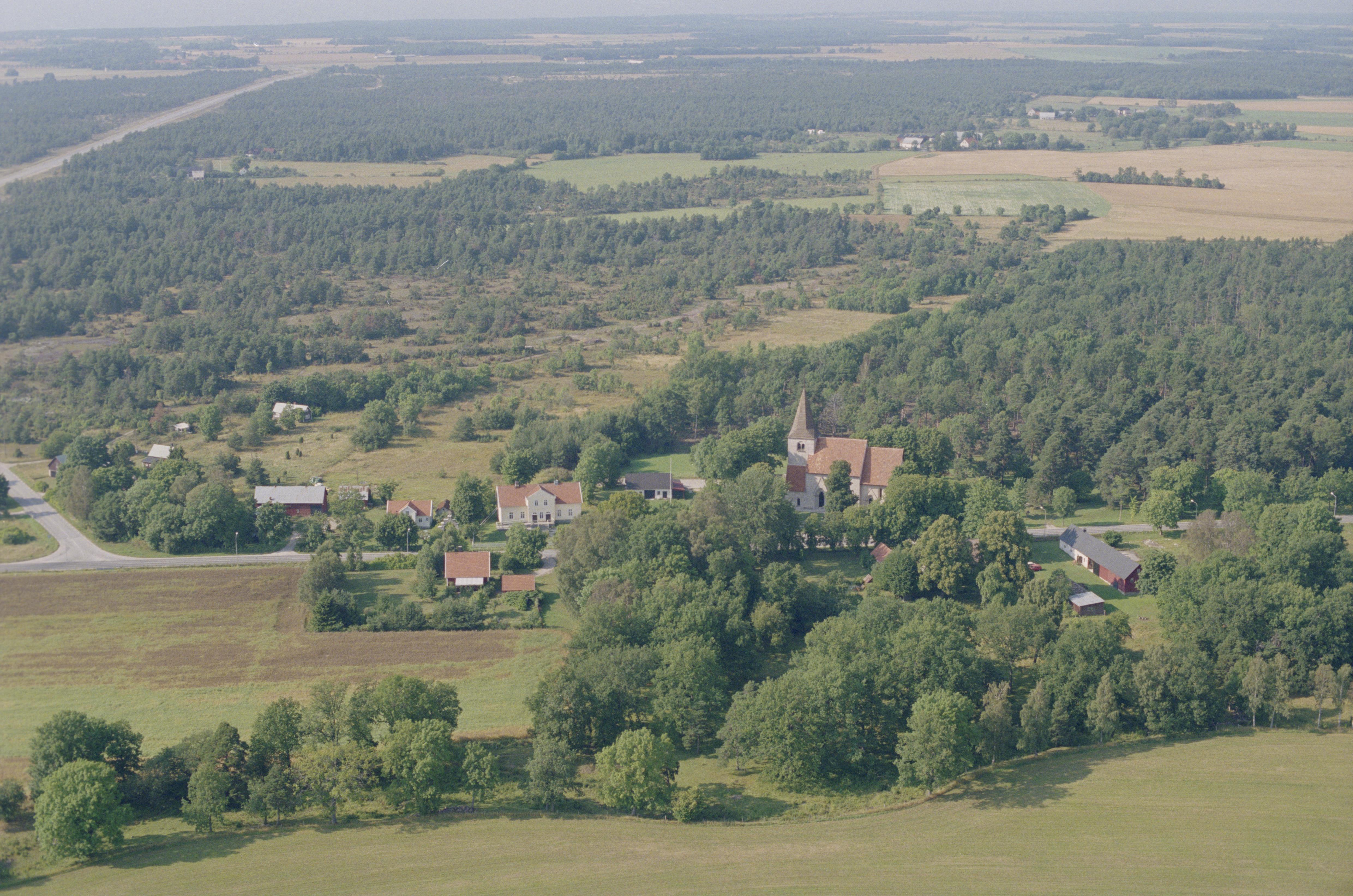 Beskrivning: Bro kyrkby. Bro kyrka till höger om bildens mitt. Nere till vänster offerkälla med svärdslipningssten och en bro RAÄnr Bro 27:1-6. Bilden är tagen mot (väderstreck): NNV