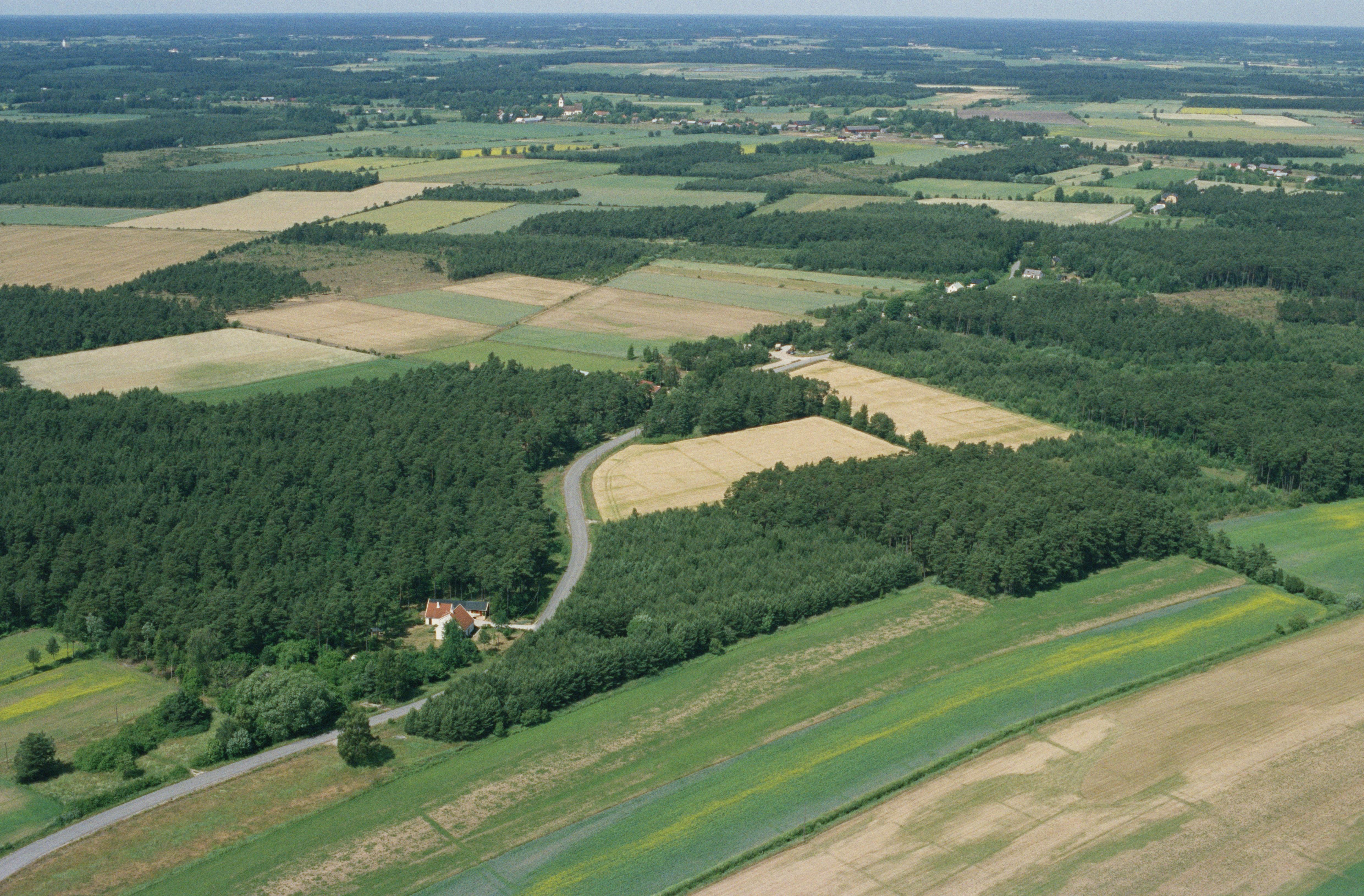 Beskrivning: I bildens nedre del området Bandlunde väster om Kärne by. Bandlunde kyrka och kyrkby uppe till vänster. Under bildens mitt område med fyndplats (malstenar) RAÄnr Burs 131:1. Gränsen mot Rone socken mellan husen nere till vänster. Bilden är tagen mot (väderstreck): NV