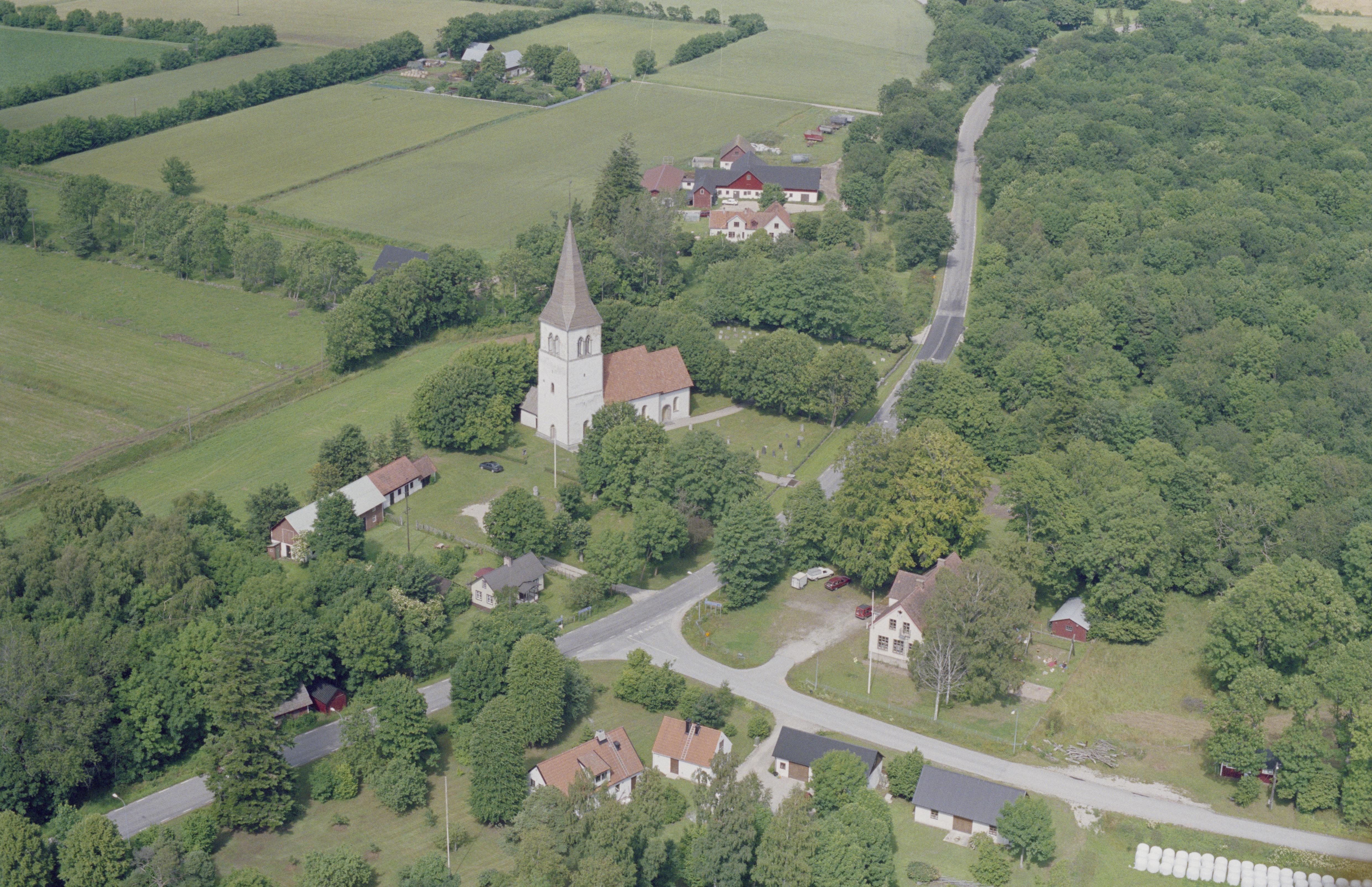 Beskrivning: Eke kyrka och kyrkby. Vid kyrkan vägmärke RAÄnr Eke 43:2. Bilden är tagen mot (väderstreck): NNO