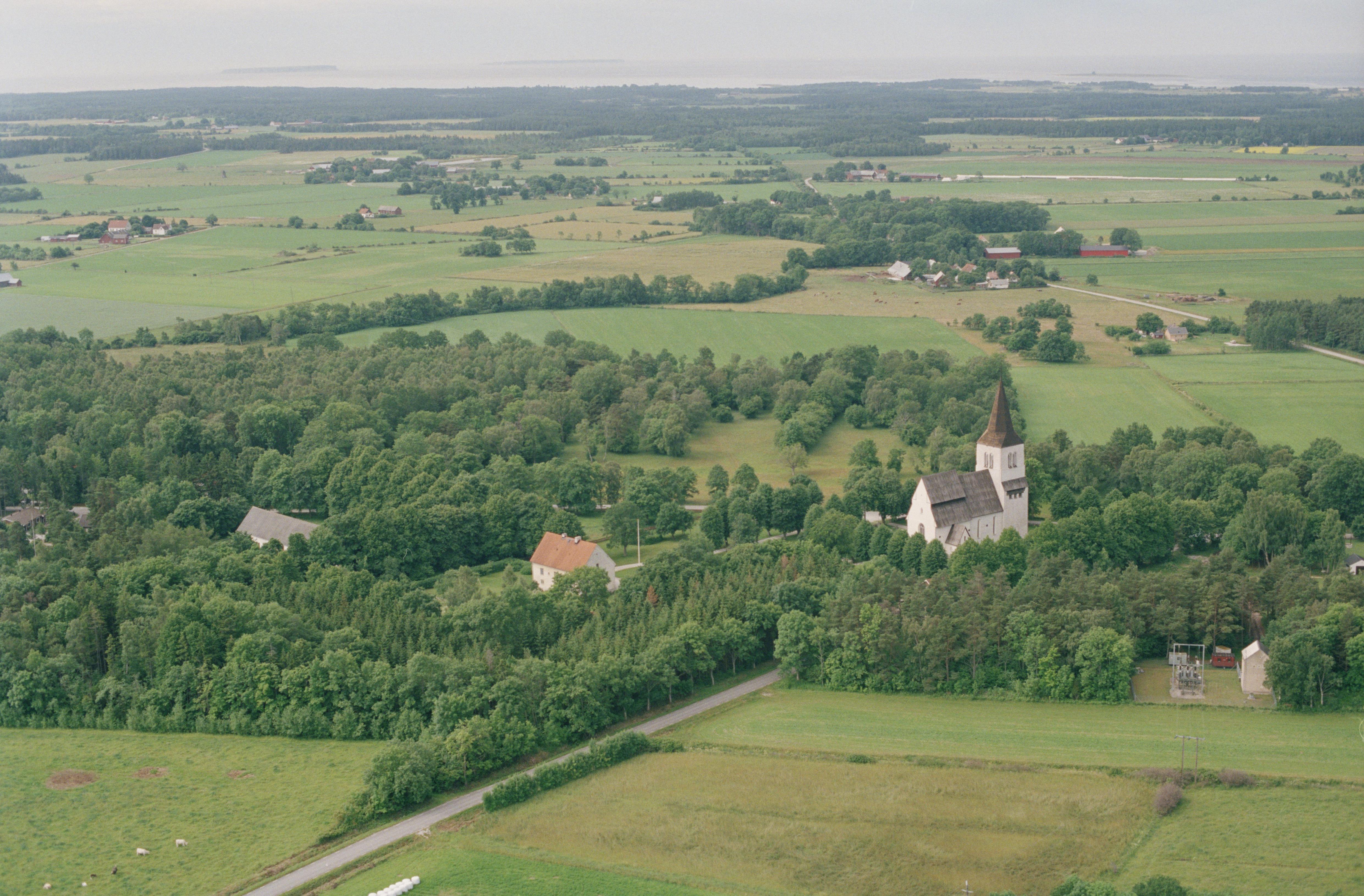Beskrivning: Eskelhems kyrkby. Eskelhems kyrka till höger under bildens mitt. Till höger över bildens mitt fossil åker och boplats RAÄnr Eskelhem 14:1. Bilden är tagen mot (väderstreck): SV