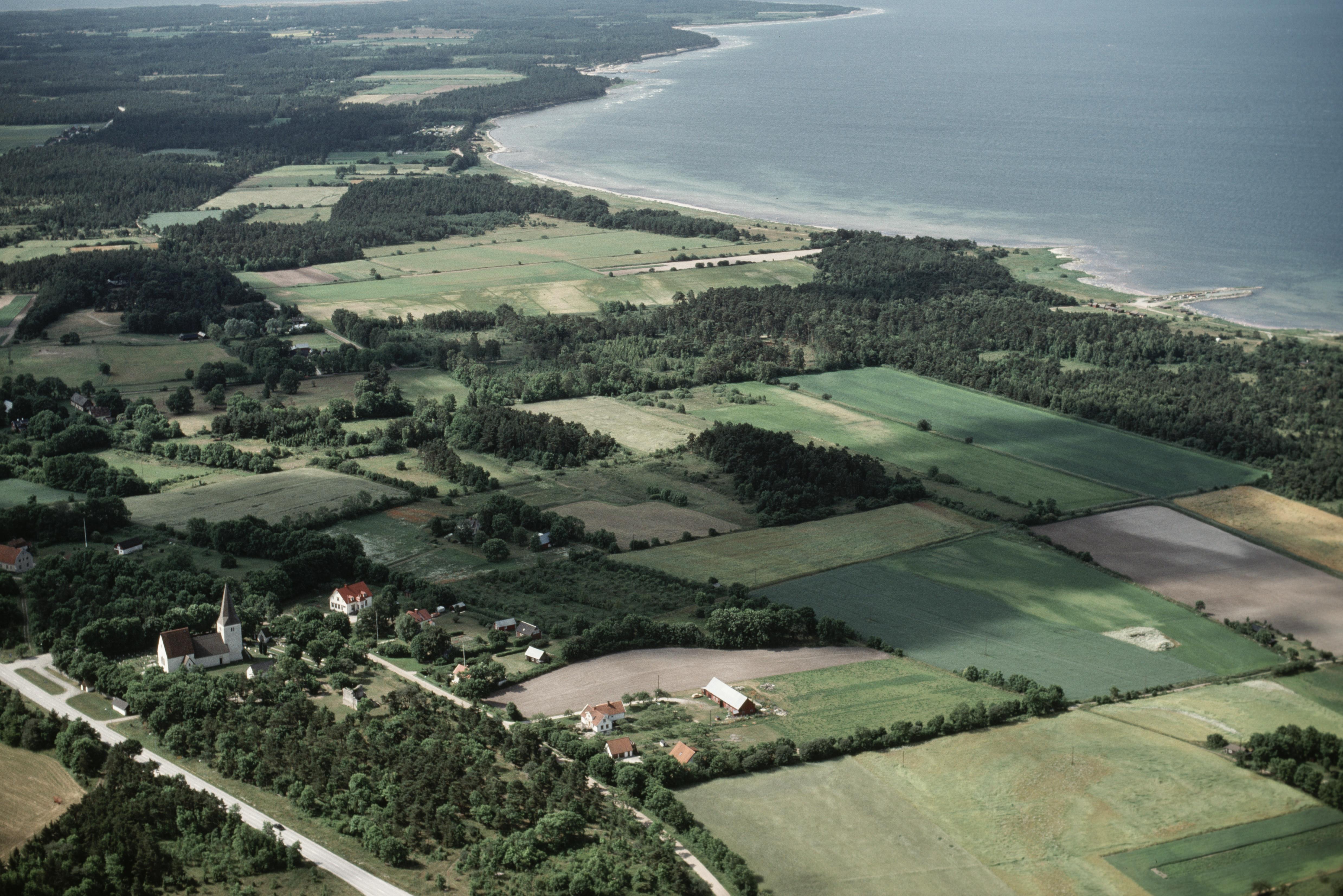Beskrivning: Fröjels kyrka och kyrkby nere till vänster. Vid kyrkan kastal (ruin) RAÄnr Fröjel 11:1. Fiskeläget Valbybodar till höger. Skansudd i Eksta socken i bildens övre kant. Bilden är tagen mot (väderstreck): SSV