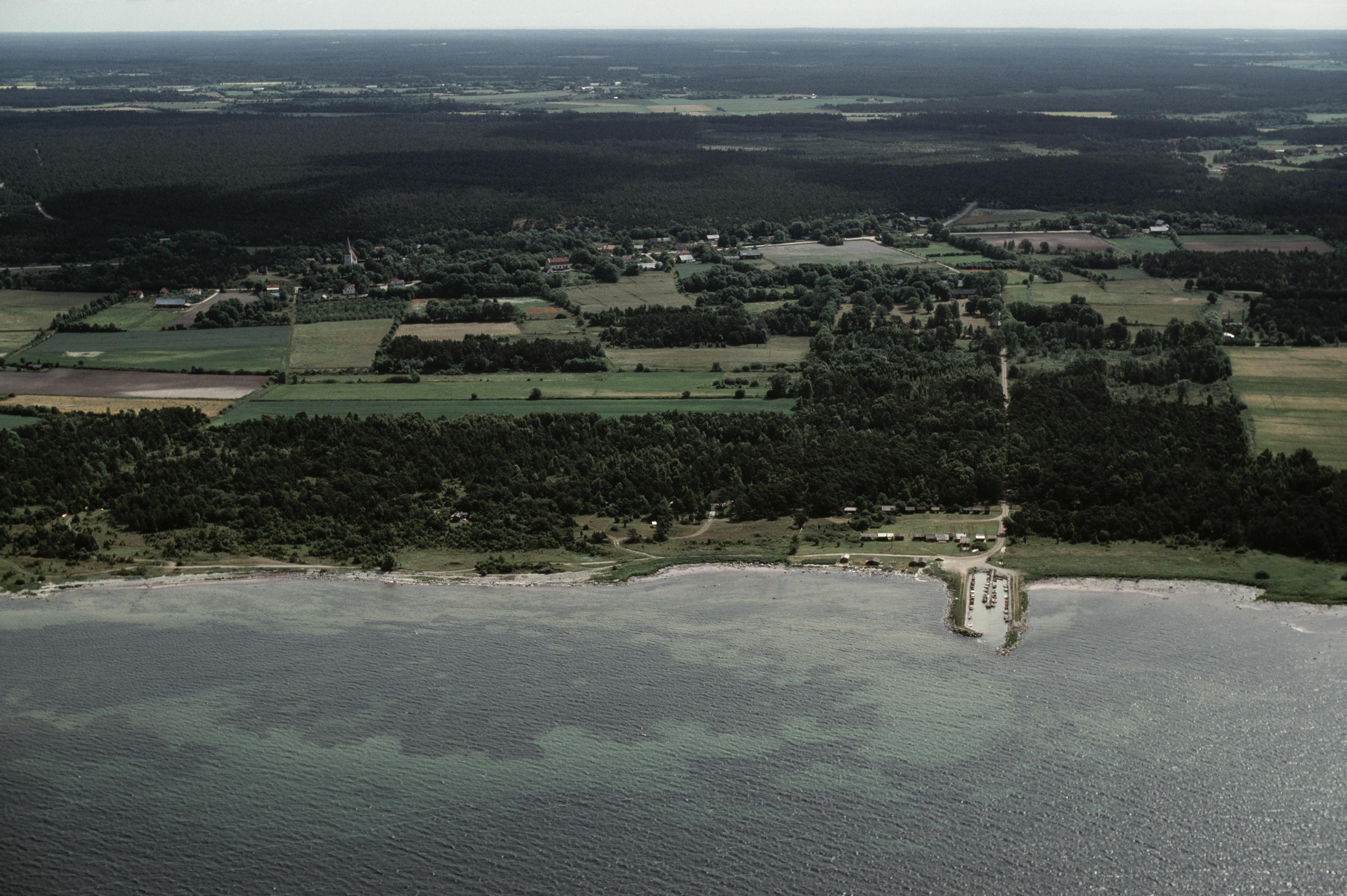 Beskrivning: Valbybodar fiskeläge. Vid piren nere till höger skeppslämning RAÄnr Fröjel 377. Fröjels kyrka och kyrkby till vänster över bildens mitt. Bilden är tagen mot (väderstreck): Ö