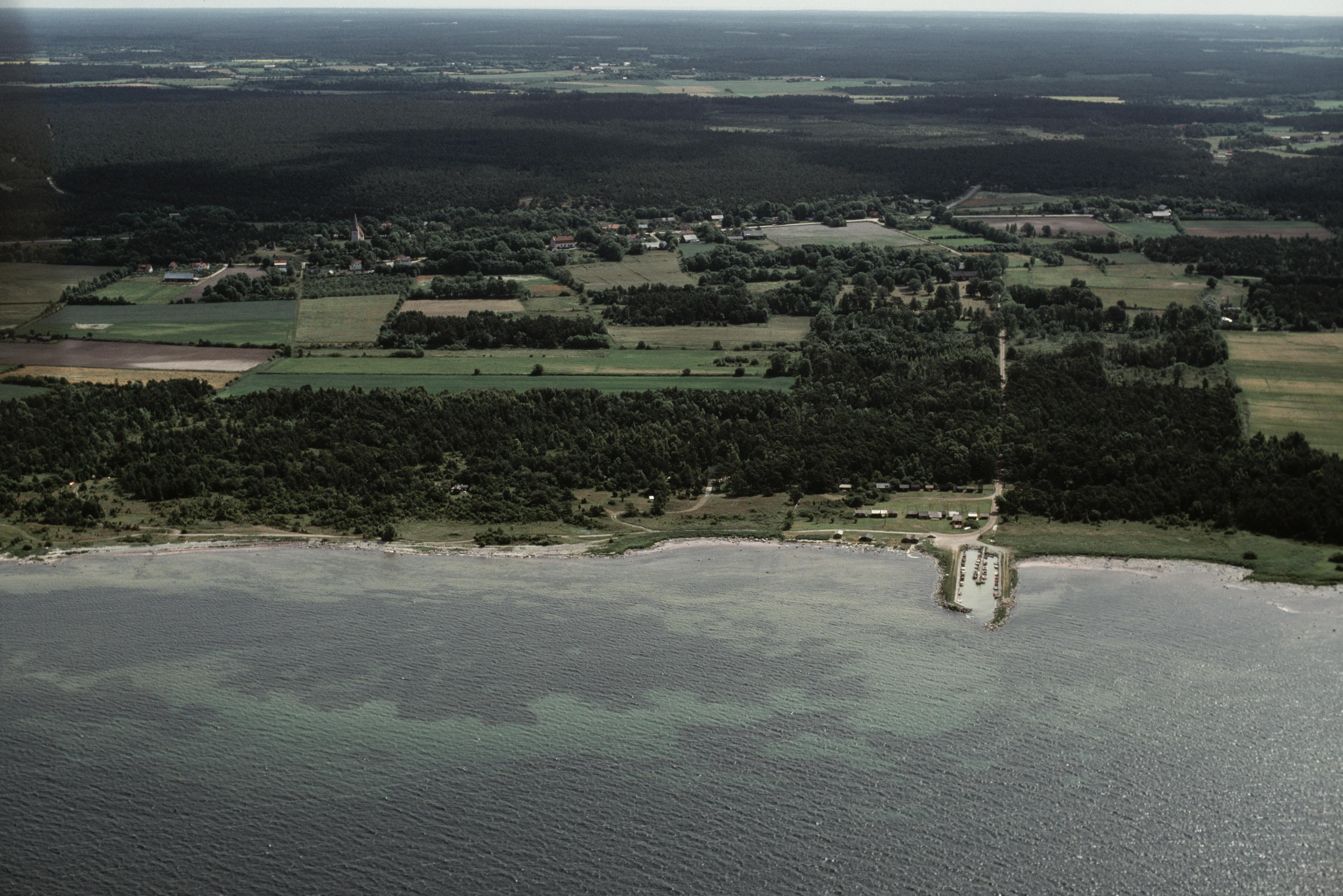 Beskrivning: Valbybodar fiskeläge. Vid piren nere till höger skeppslämning RAÄnr Fröjel 377. Fröjels kyrka och kyrkby till vänster över bildens mitt. Bilden är tagen mot (väderstreck): Ö