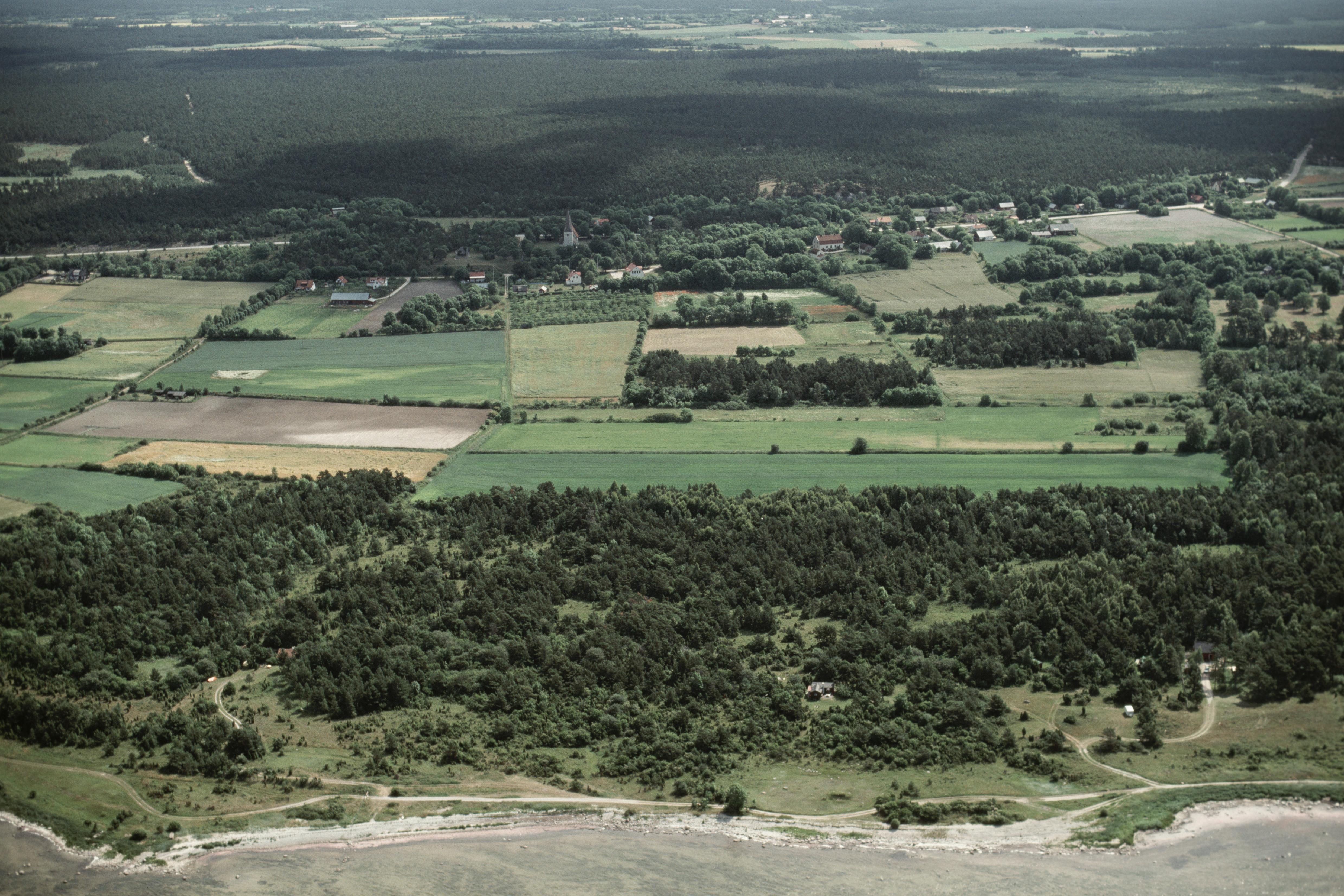 Beskrivning: Fiskeläget Valbybodar, norra delen. Under bildens mitt fossil åker RAÄnr Fröjel 232:1. Fröjels kyrka och kyrkby över bildens mitt. Bilden är tagen mot (väderstreck): Ö
