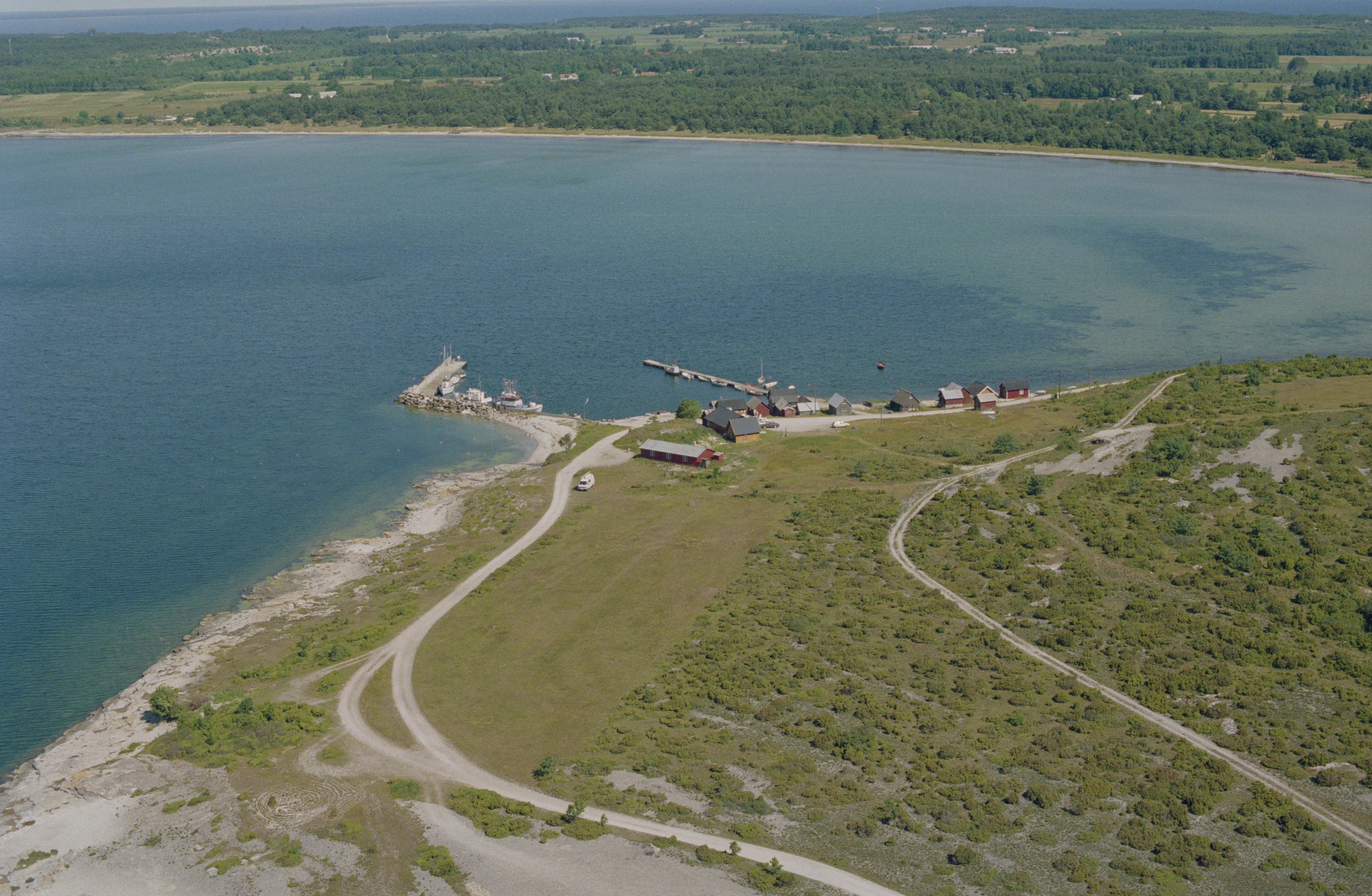 Beskrivning: Vid bildens mitt Sysne fiskeläge på Sysneudd med kalkugnsruin RAÄnr Gammelgarn 69:1. I bildens övre del Sandviken mot gränsen till socknet Östergarn. Bilden är tagen mot (väderstreck): N