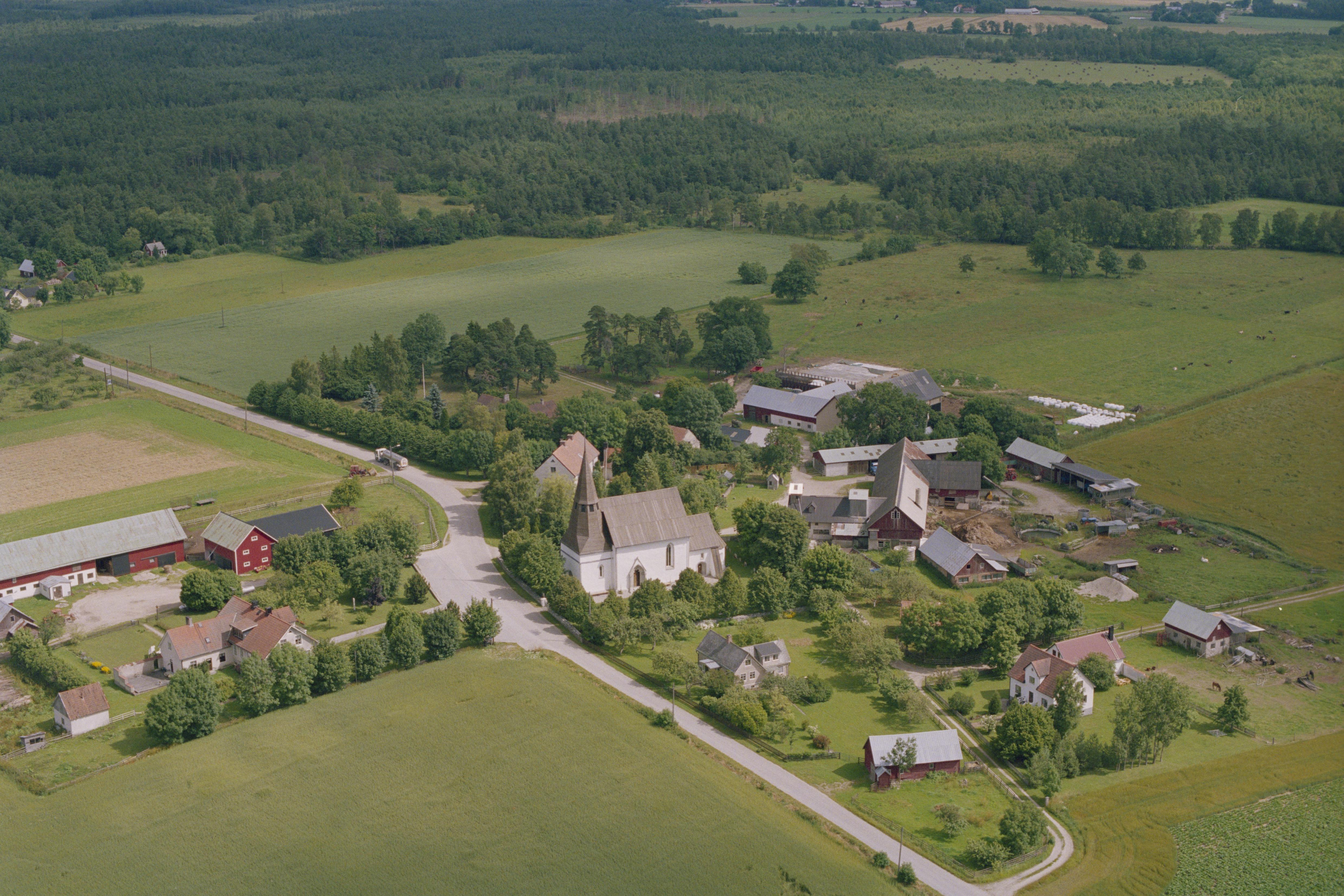 Beskrivning: Gerums kyrka vid gårdarna Hägvalds och Ajmunde. Vid kyrkan fyndplats (järnyxa) RAÄnr Gerum 60:1. Bilden är tagen mot (väderstreck): NNO