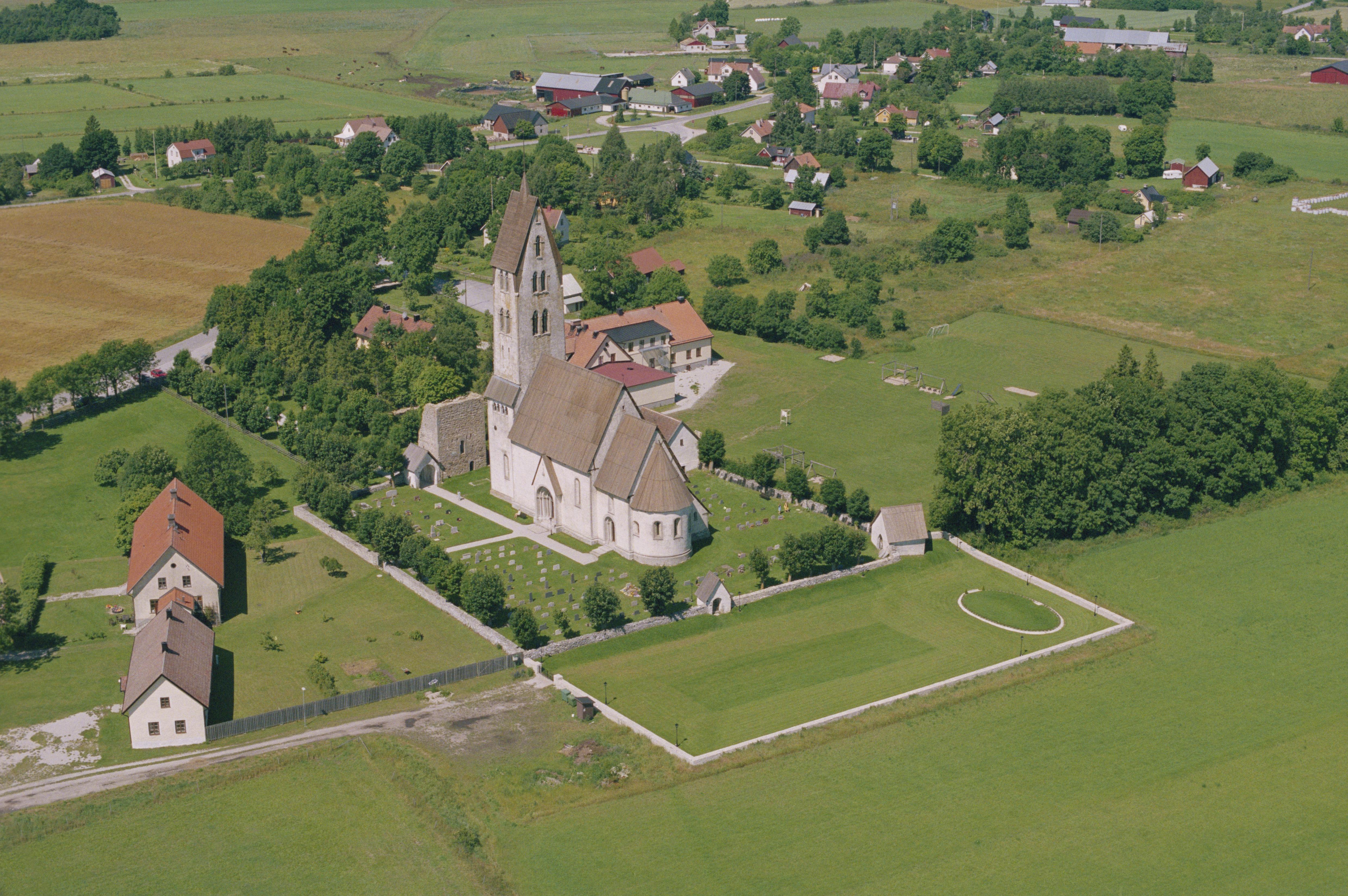 Beskrivning: Gothems kyrkby. Gothems kyrka i bildens mitt. Vid kyrkan flatmarksgrav RAÄnr Gothem 219:1. Bilden är tagen mot (väderstreck): NV