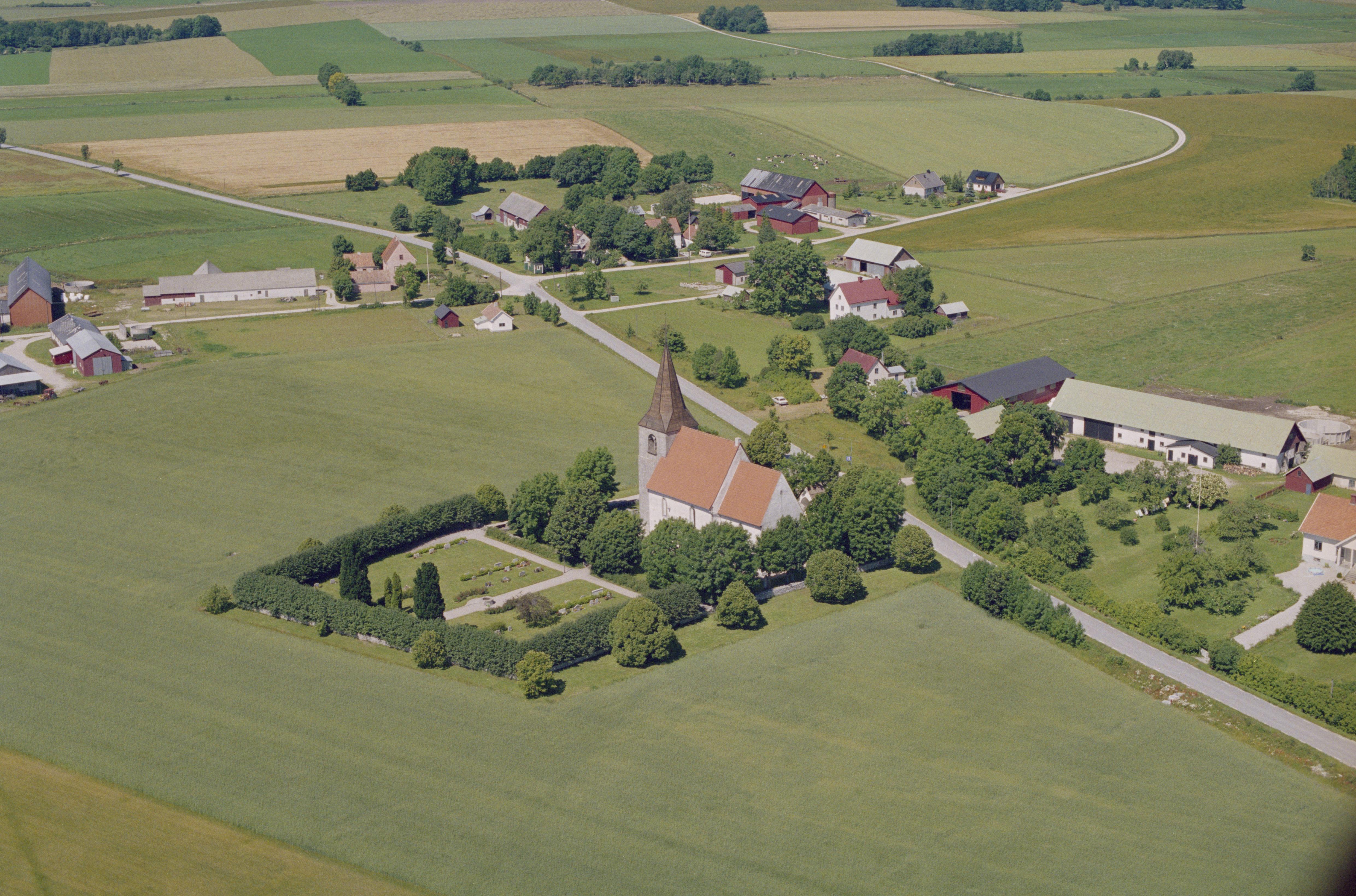 Beskrivning: Hejnums kyrkby. Hejnums kyrka, prästgård och hembygdsgård. Uppe till vänster gårdarna Stora och Lilla Kyrkebys. Uppe till höger bytomt RAÄnr Hejnum 219:1. (Bilden tillhör även Riksintresse-nr I17 - Hejnum.) Bilden är tagen mot (väderstreck): NV