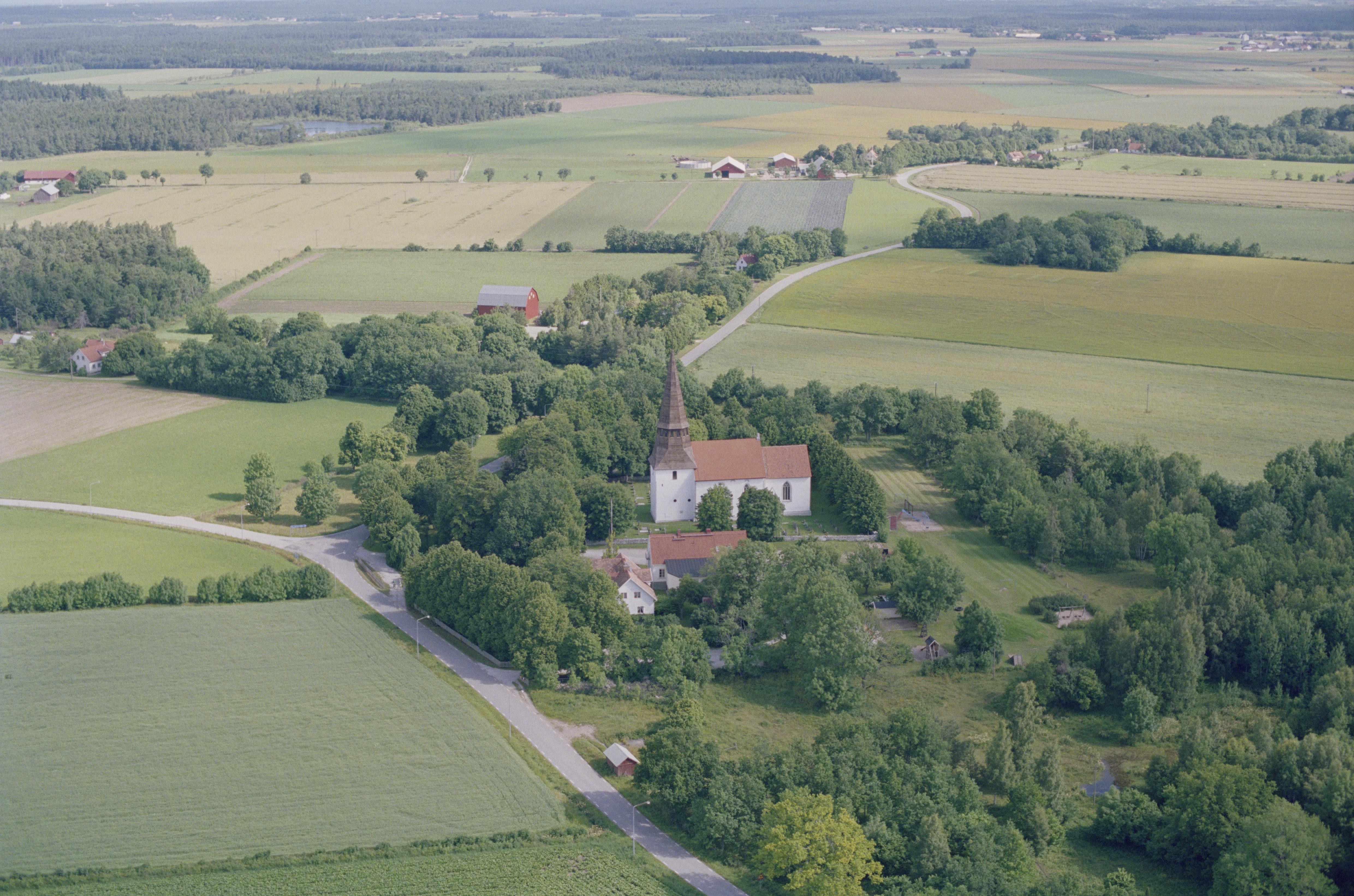 Beskrivning: Hogräns kyrkby. Hogräns kyrka i bildens mitt. Vid kyrkan flera fornlämningar; husgrund RAÄnr Högrän 70:1, gravfält Hogrän 9:1, bytomt Hogrän 105 m.fl. Bilden är tagen mot (väderstreck): N