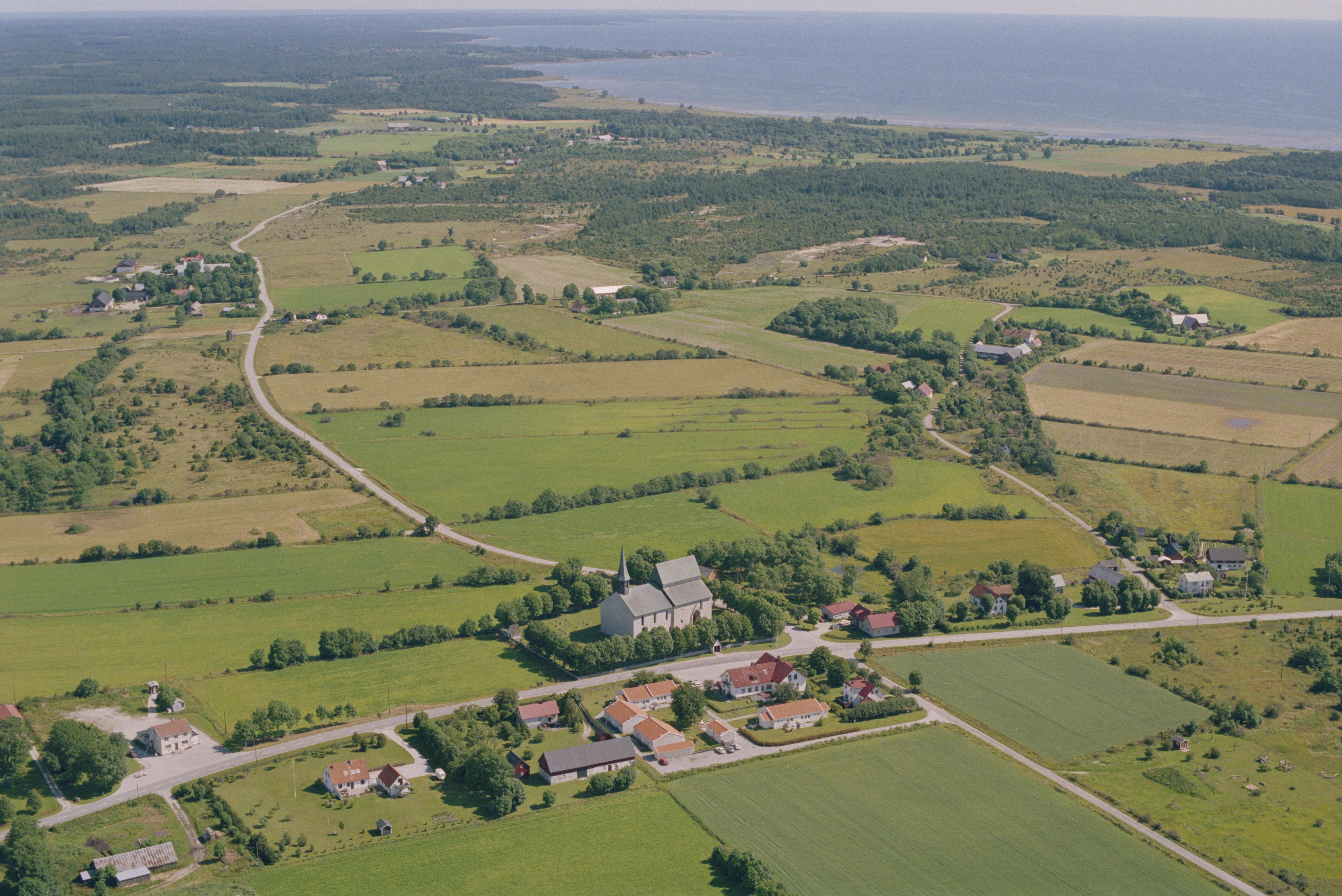 Beskrivning: Lau kyrkby i området Lausbackar. Lau kyrka under bildens mitt. Vid kyrkan boplats RAÄnr Lau 161:1. Bilden är tagen mot (väderstreck): NO