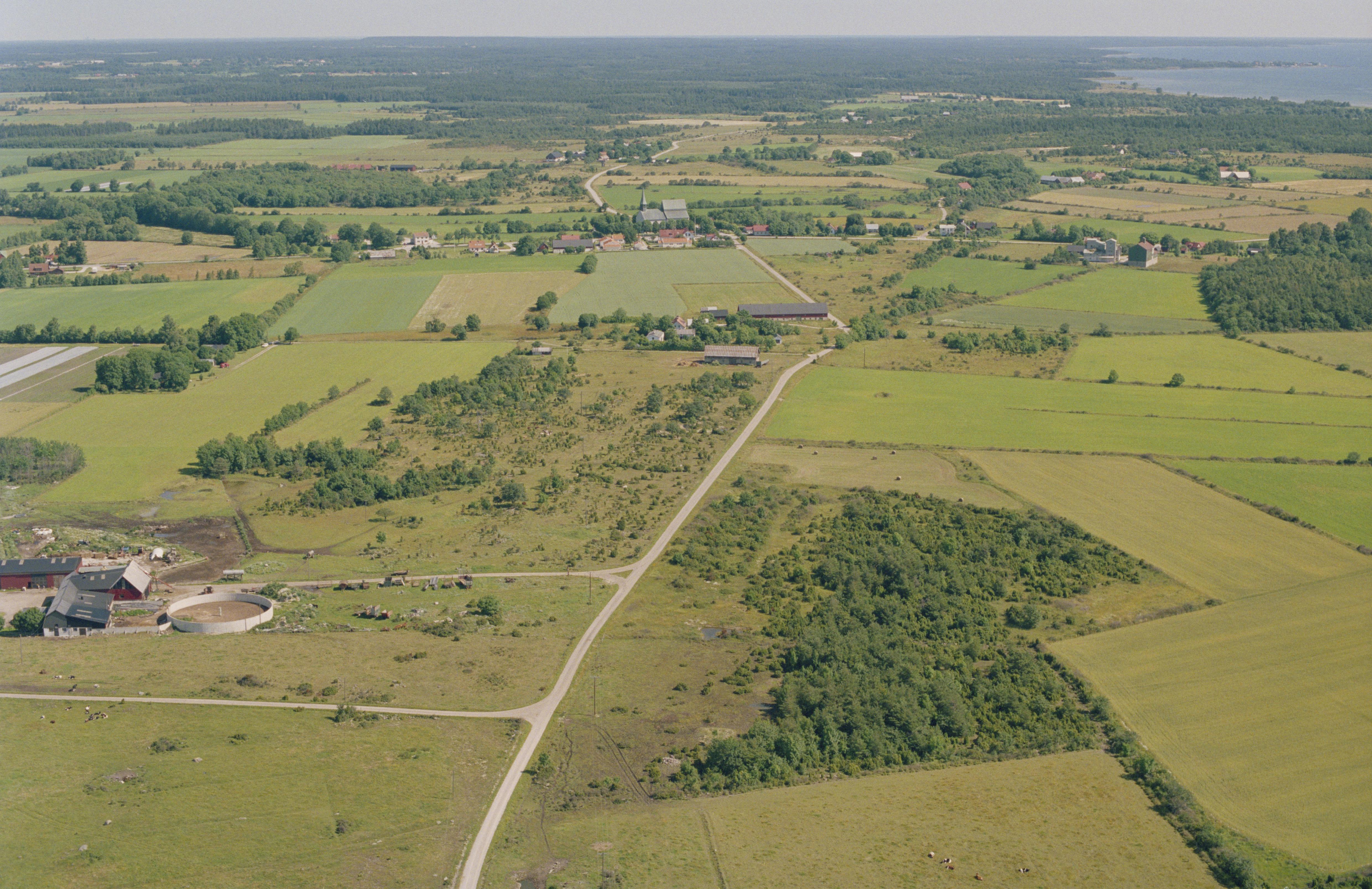 Beskrivning: Området Lausbackar. Till vänster i bildens nedre del gravfält RAÄnr Lau 7:1, stensättningar Lau 108:1-3 m.m. i området Gannor. Lau kyrka och kyrkby i bildens övre del. Bilden är tagen mot (väderstreck): NO