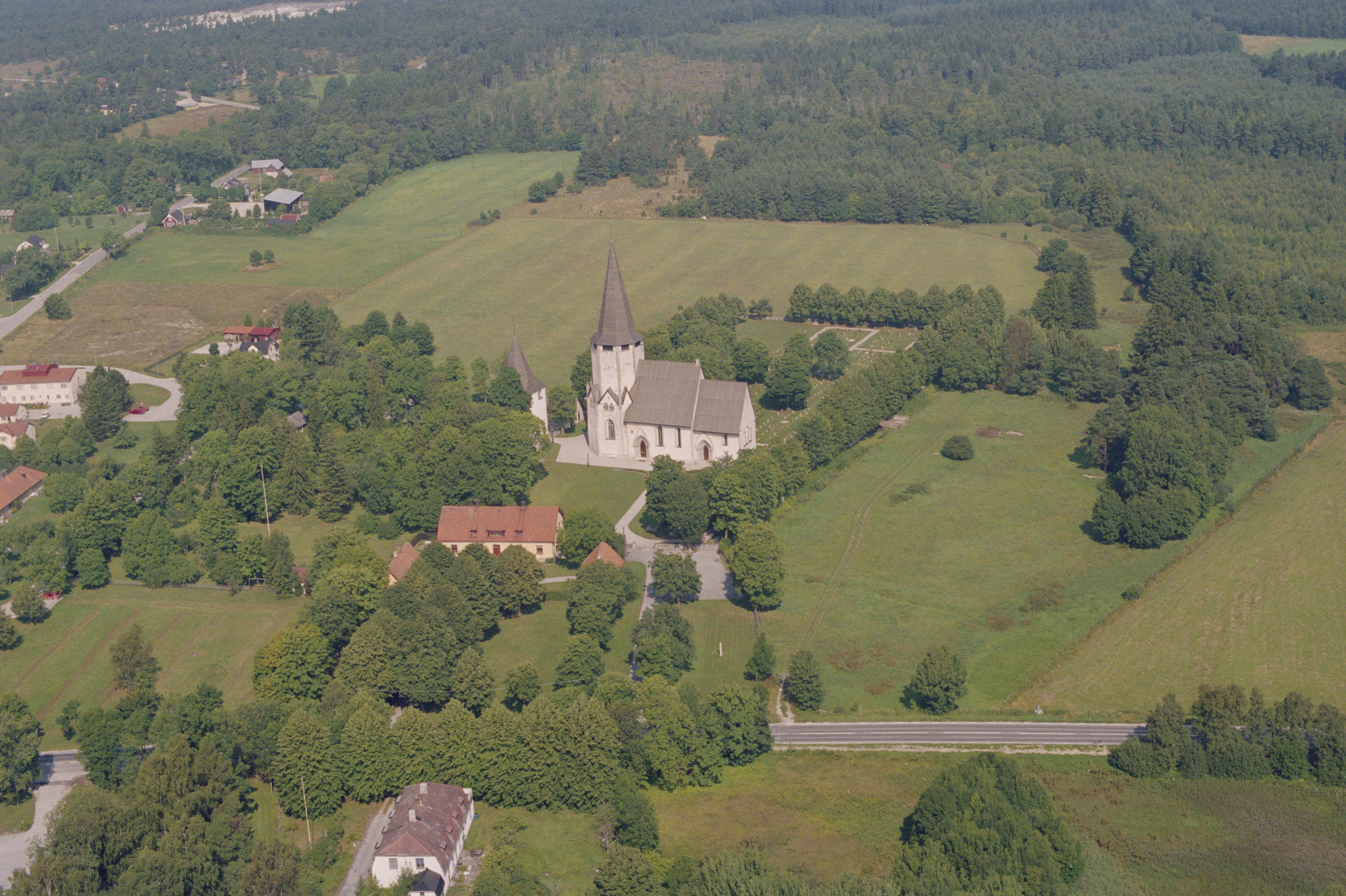 Beskrivning: Lärbro kyrkby. Lärbro kyrka vid bildens mitt. Vid kyrkan stensättning RAÄnr Lärbro 179:1. Bilden är tagen mot (väderstreck): NNV