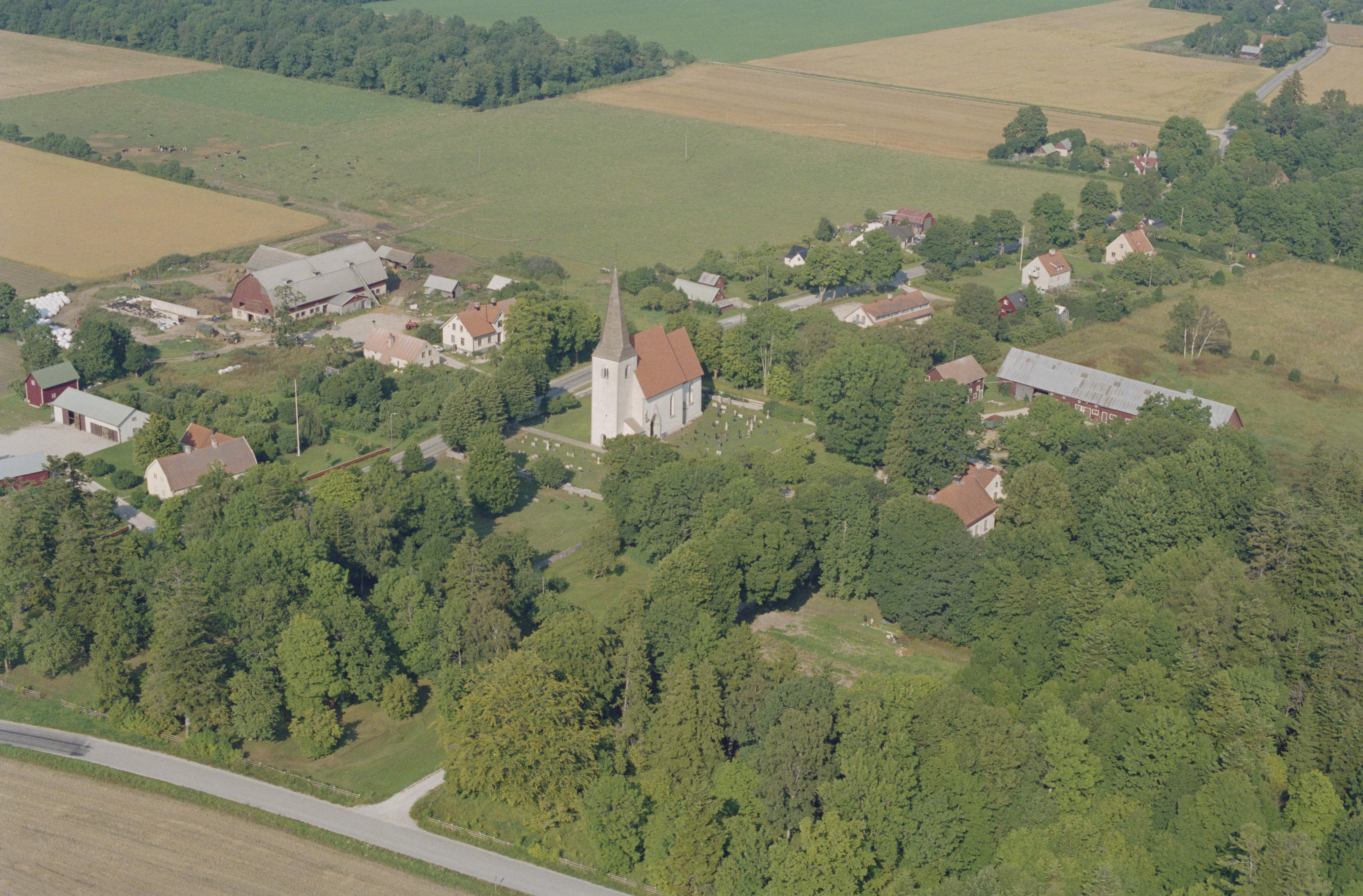 Beskrivning: Martebo kyrkby. Martebo kyrka i bildens mitt. Vid kyrkan begravningsplats RAÄnr Martebo 93:1. Bilden är tagen mot (väderstreck): NO