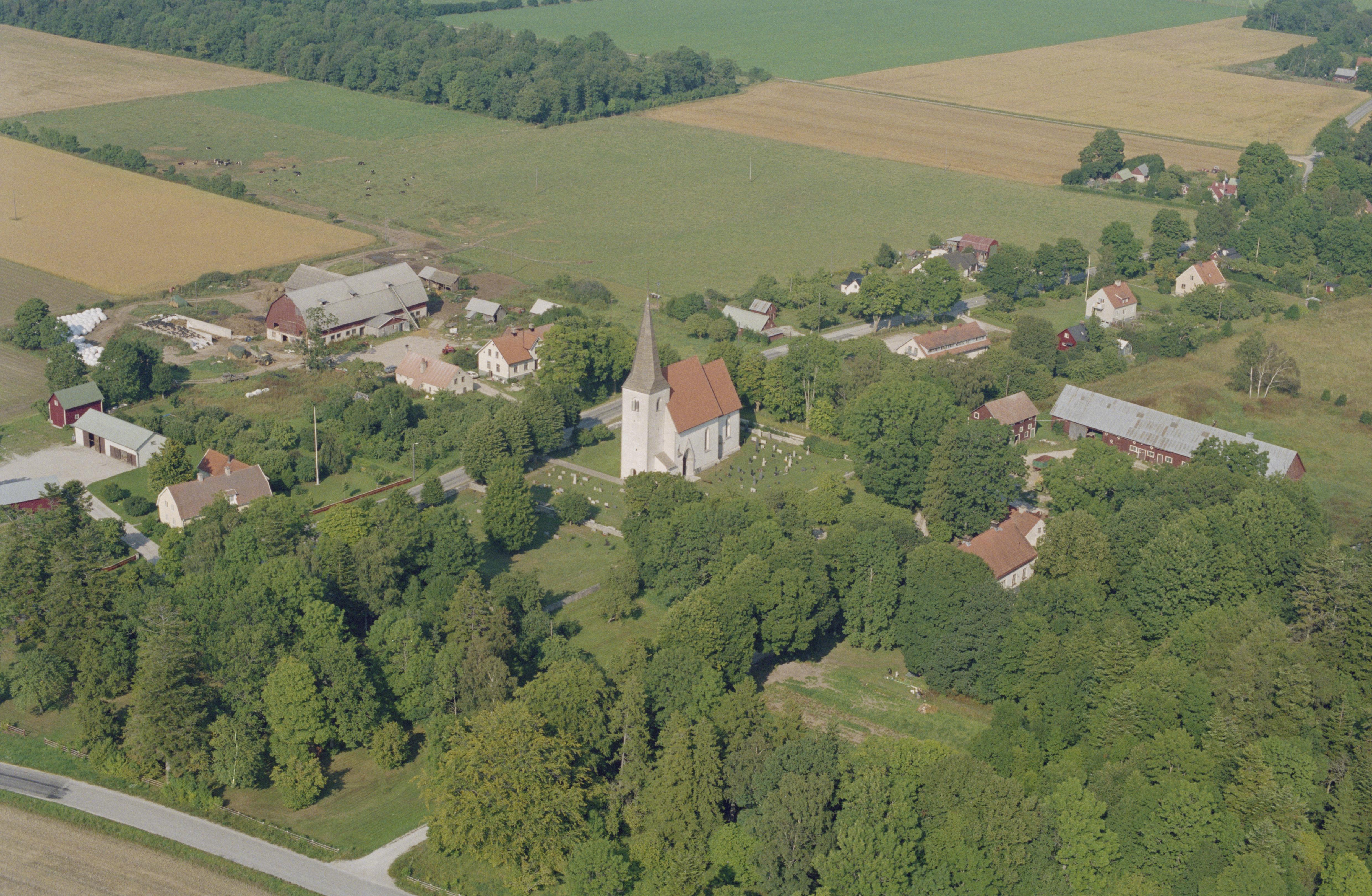 Beskrivning: Martebo kyrkby. Martebo kyrka i bildens mitt. Vid kyrkan begravningsplats RAÄnr Martebo 93:1. Bilden är tagen mot (väderstreck): NO