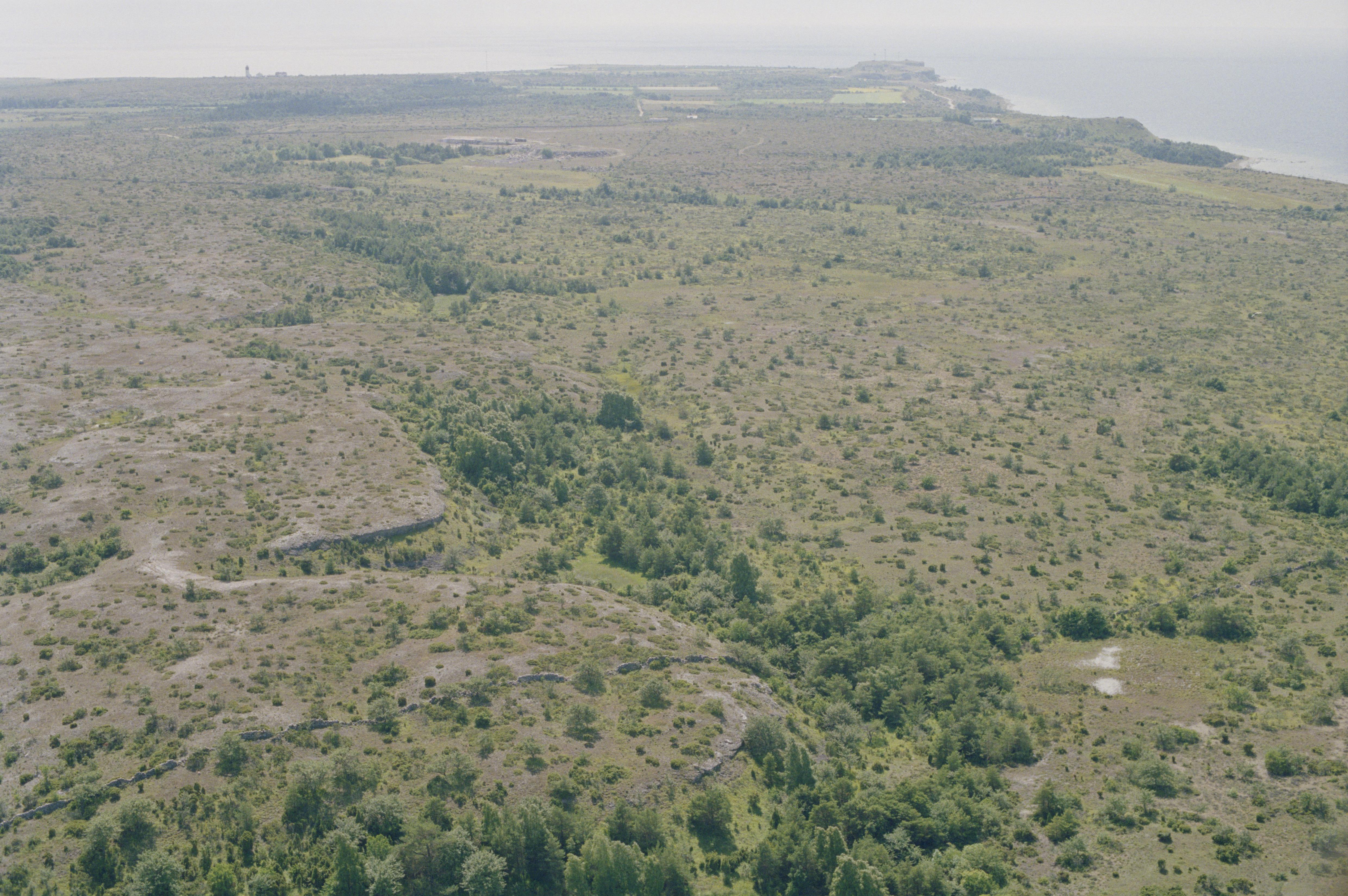Beskrivning: Området Västerbackar och Vaktbackars naturreservat. Över bildens mitt område med stensättningar RAÄnr Sundre 12:1-3. I bildens övre del Hoburgs fyrplats och området Hoburgen i öns sydvästra ände. Bilden är tagen mot (väderstreck): SSV