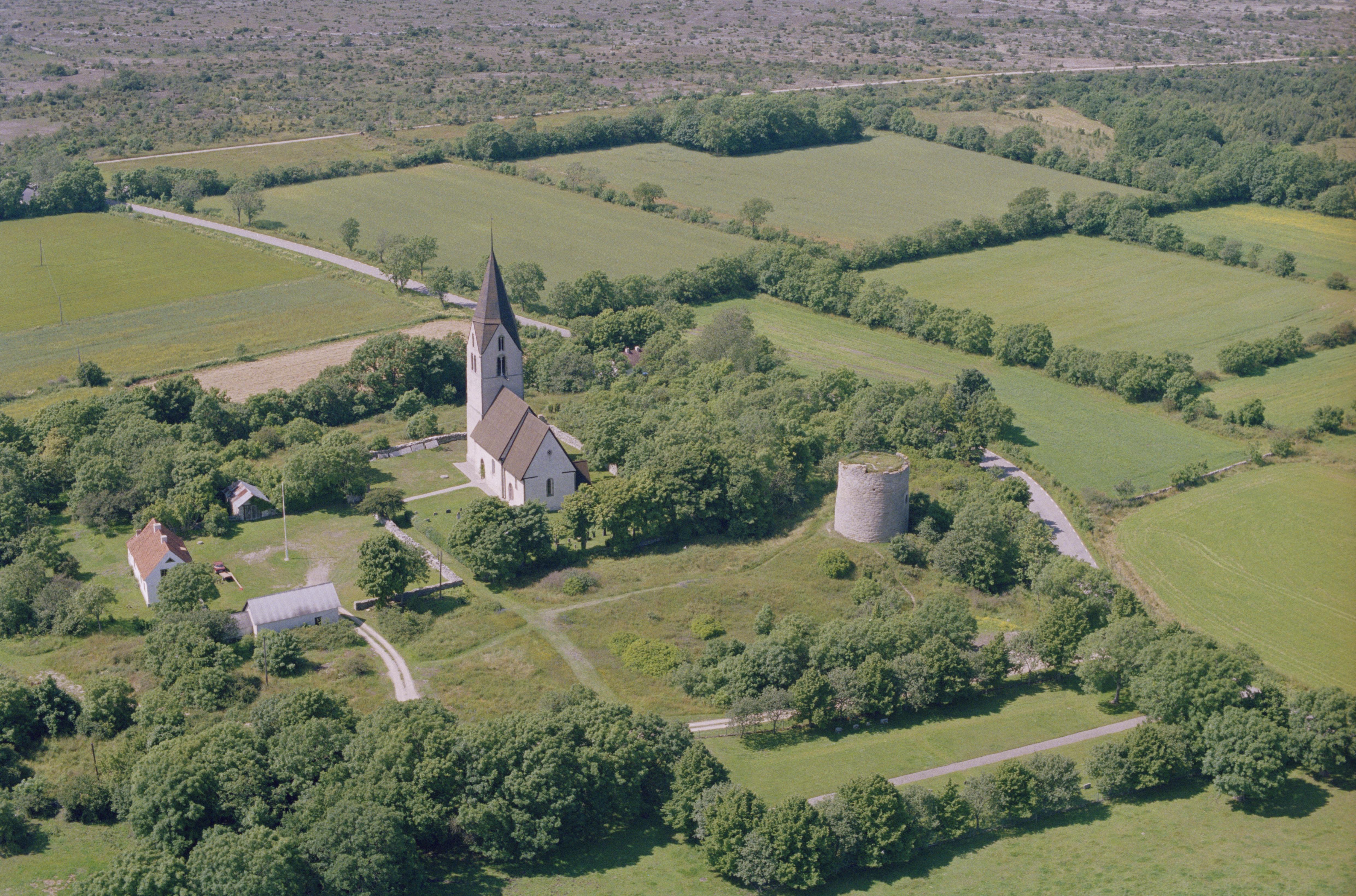 Beskrivning: Sundre kyrka. Sundre kastal / borg RAÄnr Sundre 43:1 till höger. Bilden är tagen mot (väderstreck): VNV