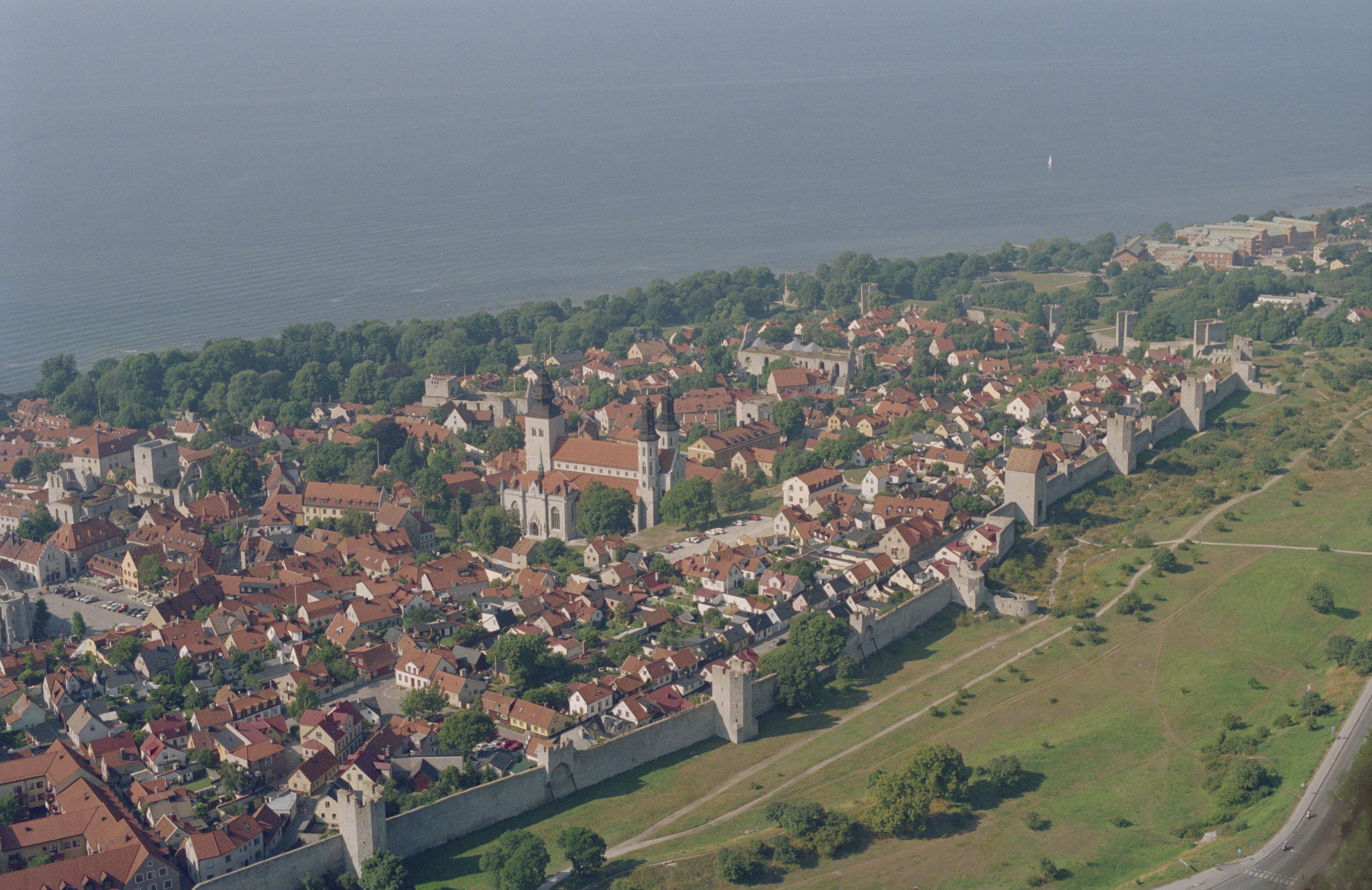 Beskrivning: Visby stad. Visby innerstad med Visby ringmur i stadslager RAÄnr Visby 107:1. Vid bildens mitt Visby domkyrka. Till vänster kyrkoruinerna Drotten RAÄnr Visby 58:1 och Sankt Lars RAÄnr Visby 59:1. Till höger över bildens mitt kyrkoruinerna Sankt Klemens RAÄnr Visby 56:1, Sankt Nikolaus RAÄnr Visby 53:1 m.fl. Bilden är tagen mot (väderstreck): NV