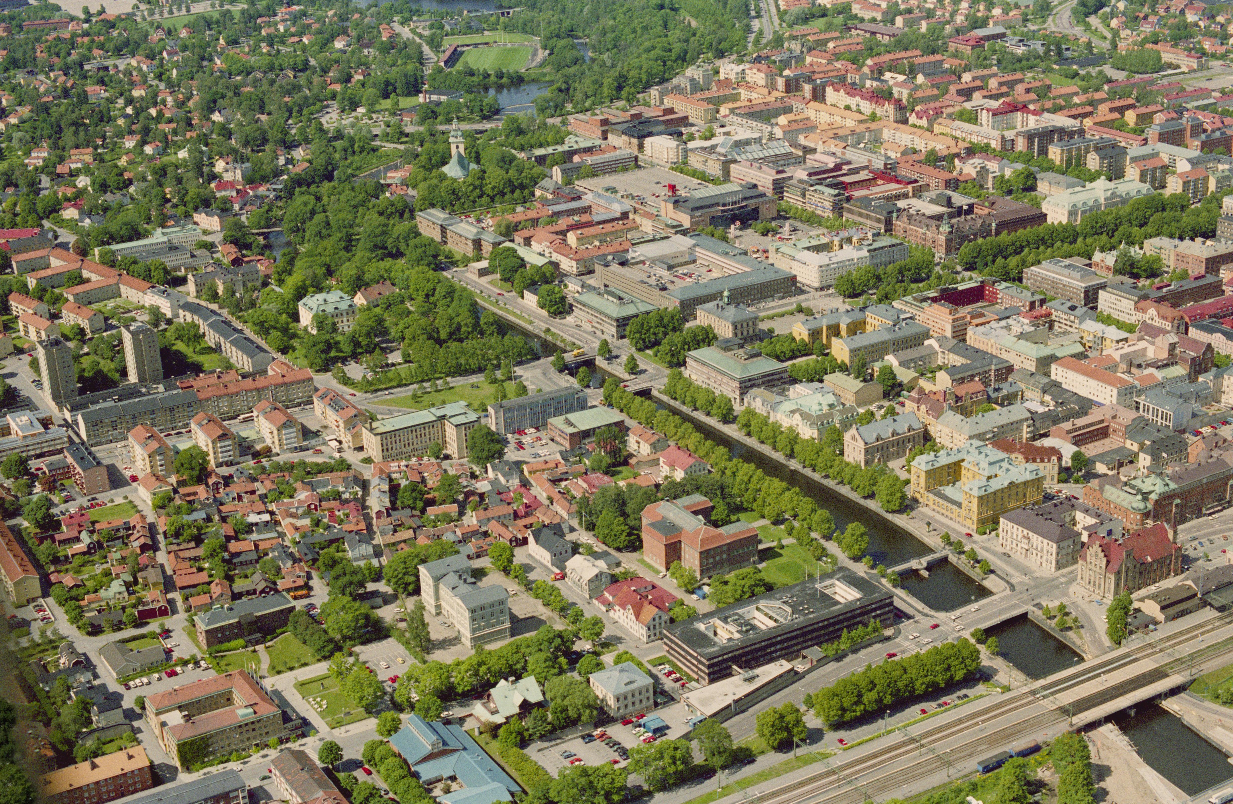 Beskrivning: Gävle tätort och Gavleån. Stadslager RAÄnr Gävle 51:1. Till vänster över bildens mitt Heliga Trefaldighetskyrkan. Bilden är tagen mot (väderstreck): V