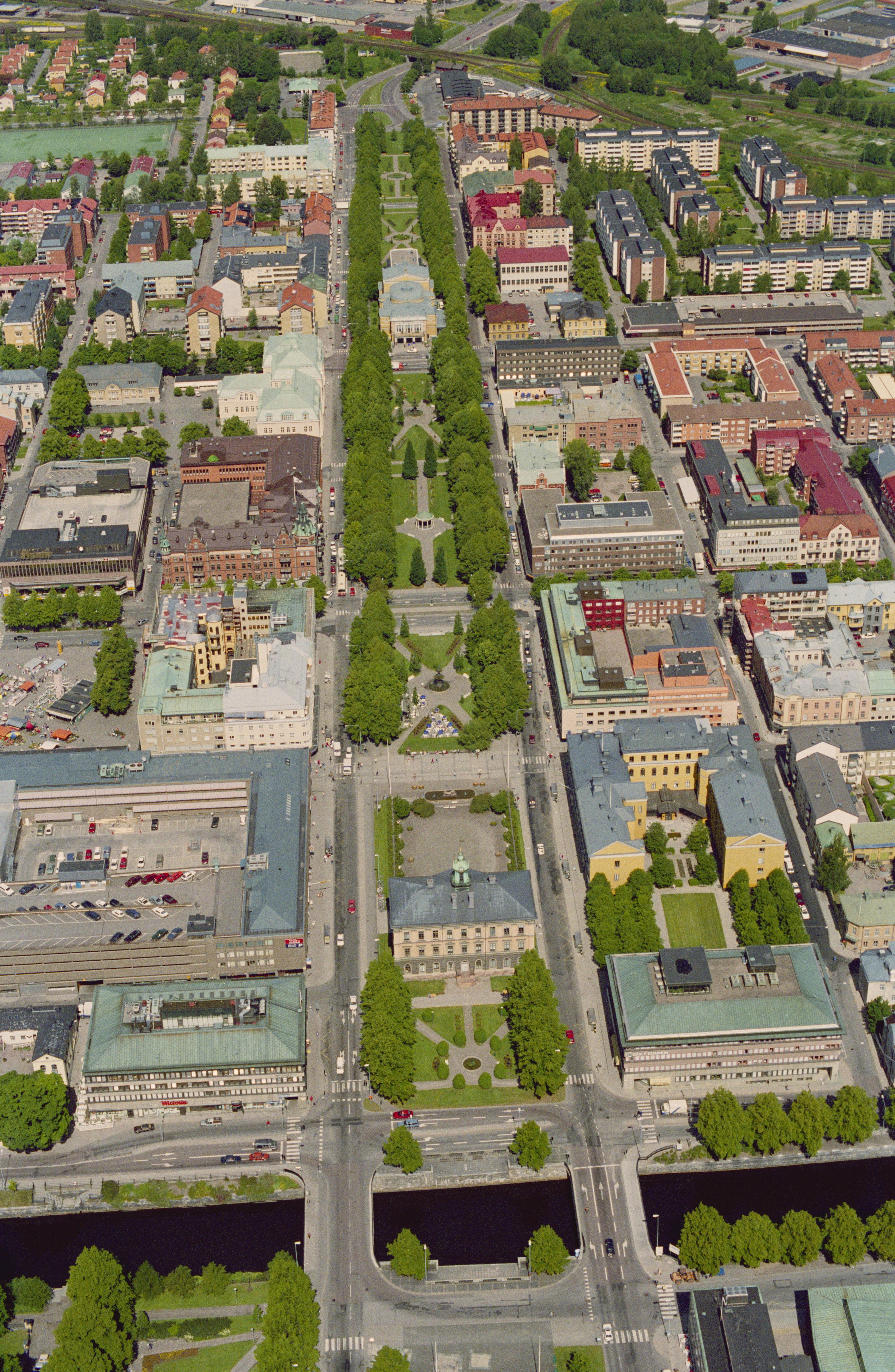 Beskrivning: Gävle tätort. Gavleån i bildens nedre kant. Stadslager RAÄnr Gävle 51:1. Stadshuset och Rådhustorget under bildens mitt. Byggnadsminnet Gävle teater i bildens övre del. Bilden är tagen mot (väderstreck): NNV