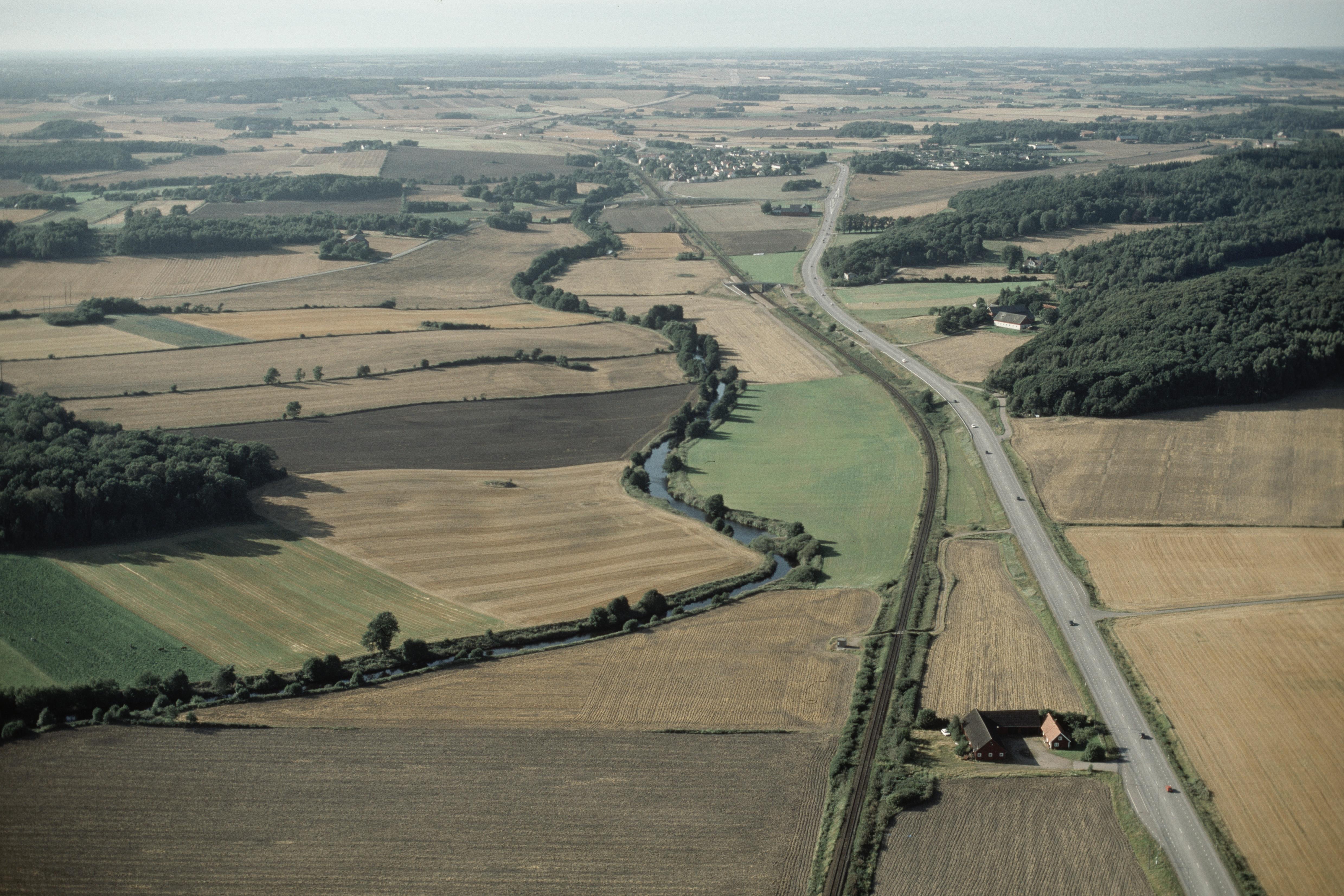 Beskrivning: Gravfält och Skotthögen RAÄnr Eftra 27:1 och 28:1 m.fl. uppe till höger vid Hanarps gård. I bildens övre del Heberg i Årstads socken. Bilden är tagen mot (väderstreck): NV
