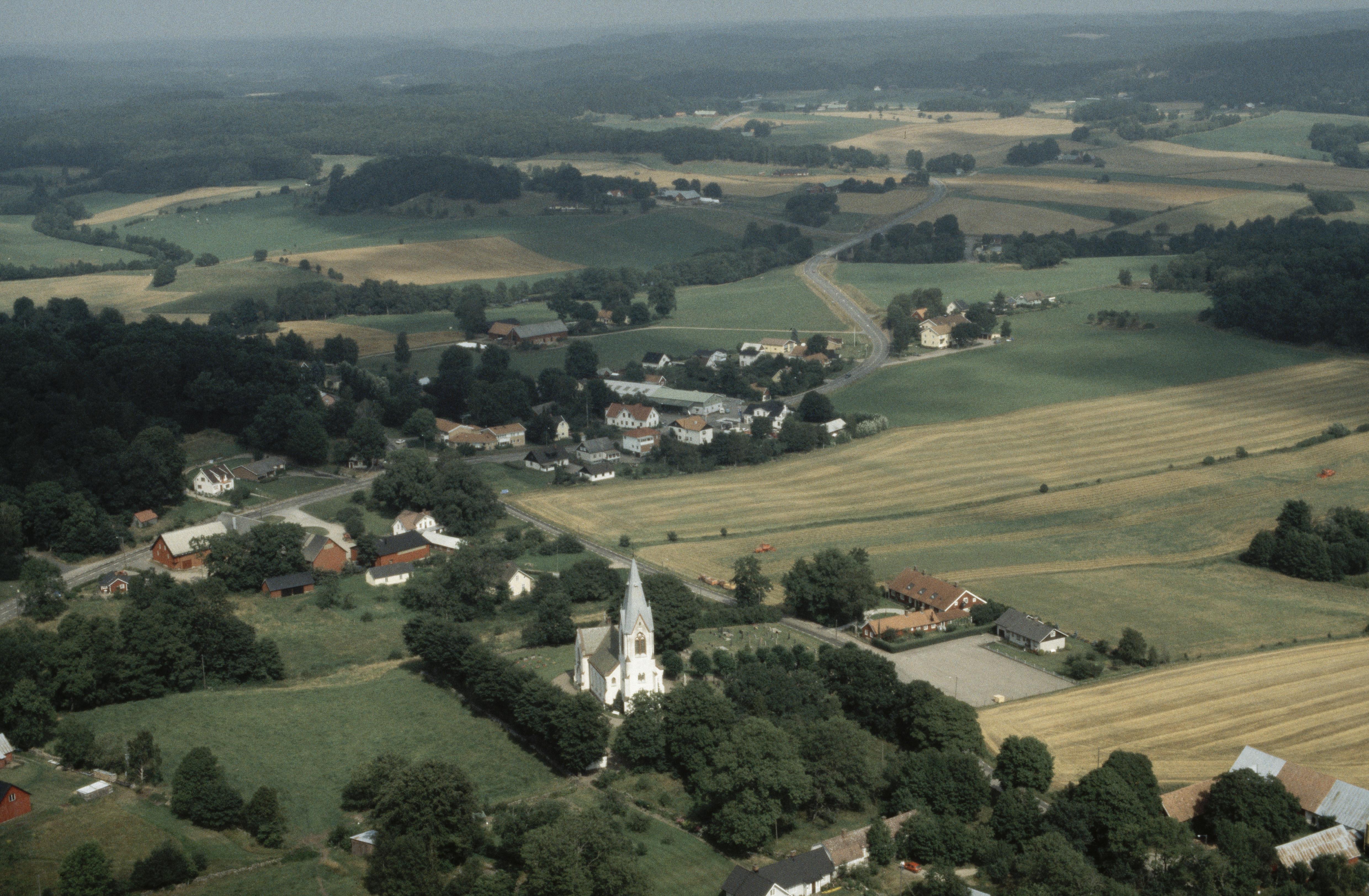 Beskrivning: Köinge kyrka och kyrkby i Ätradalen. Bilden är tagen mot (väderstreck): ONO