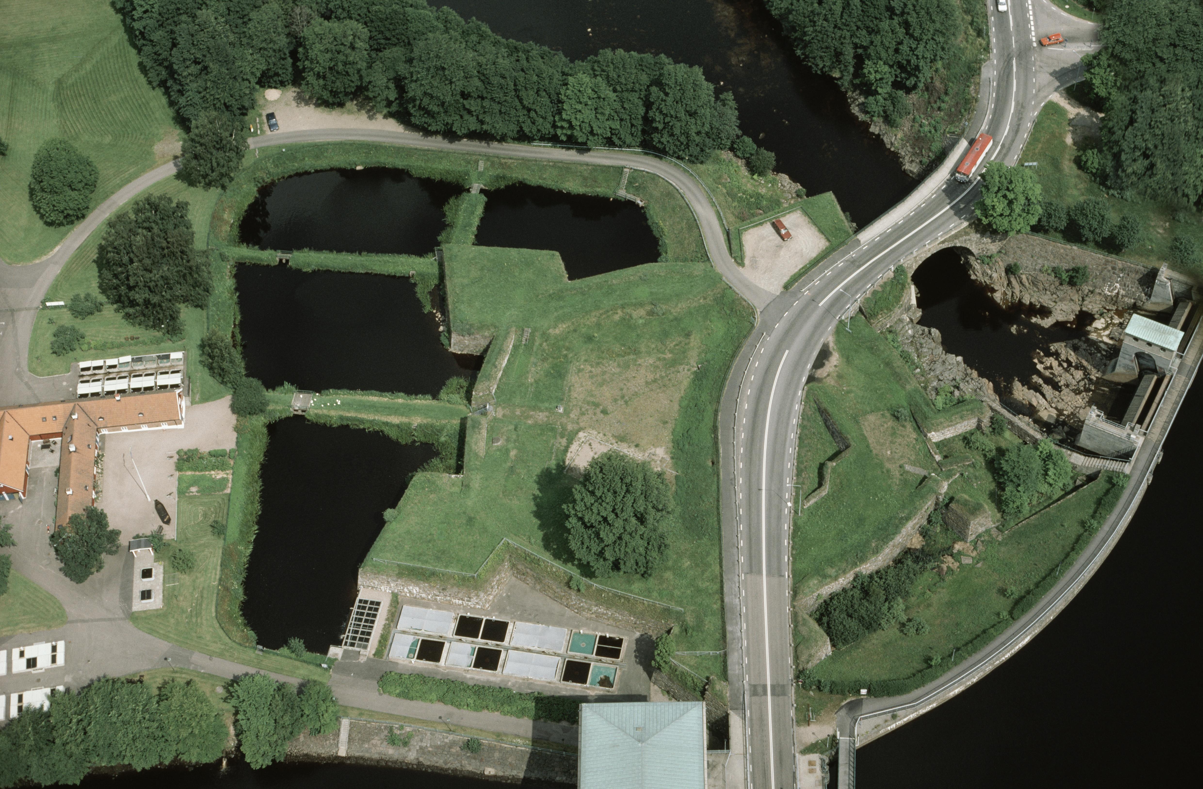 Beskrivning: Laholms stad med Lagaholm. Lämningar efter fästning RAÄnr Laholm 38:1 på Skansholmen i ån Lagan. Bilden är tagen mot (väderstreck): V