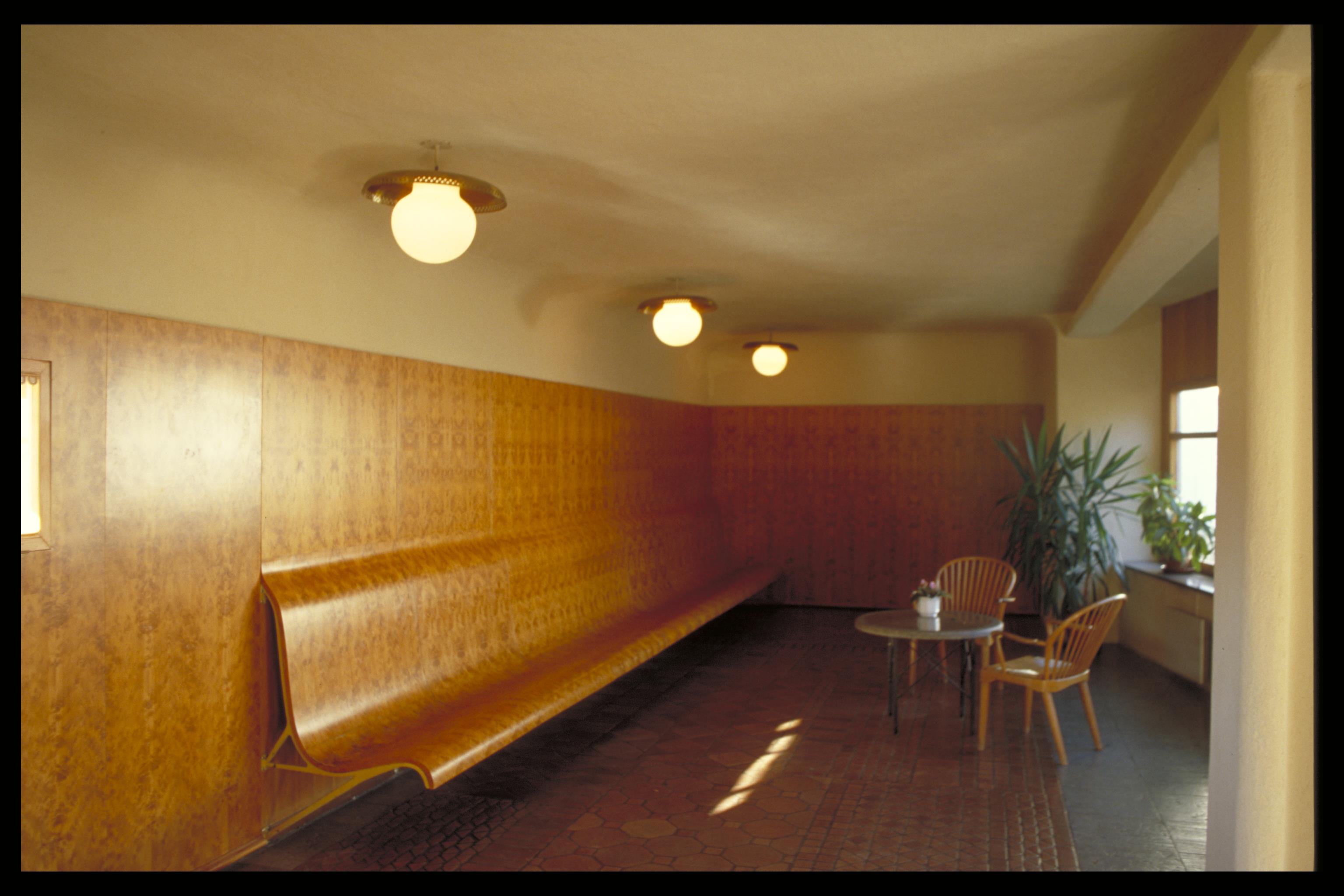 Skogskrematoriet. Väntrum med panel och bänk i jämtländsk vresfur.