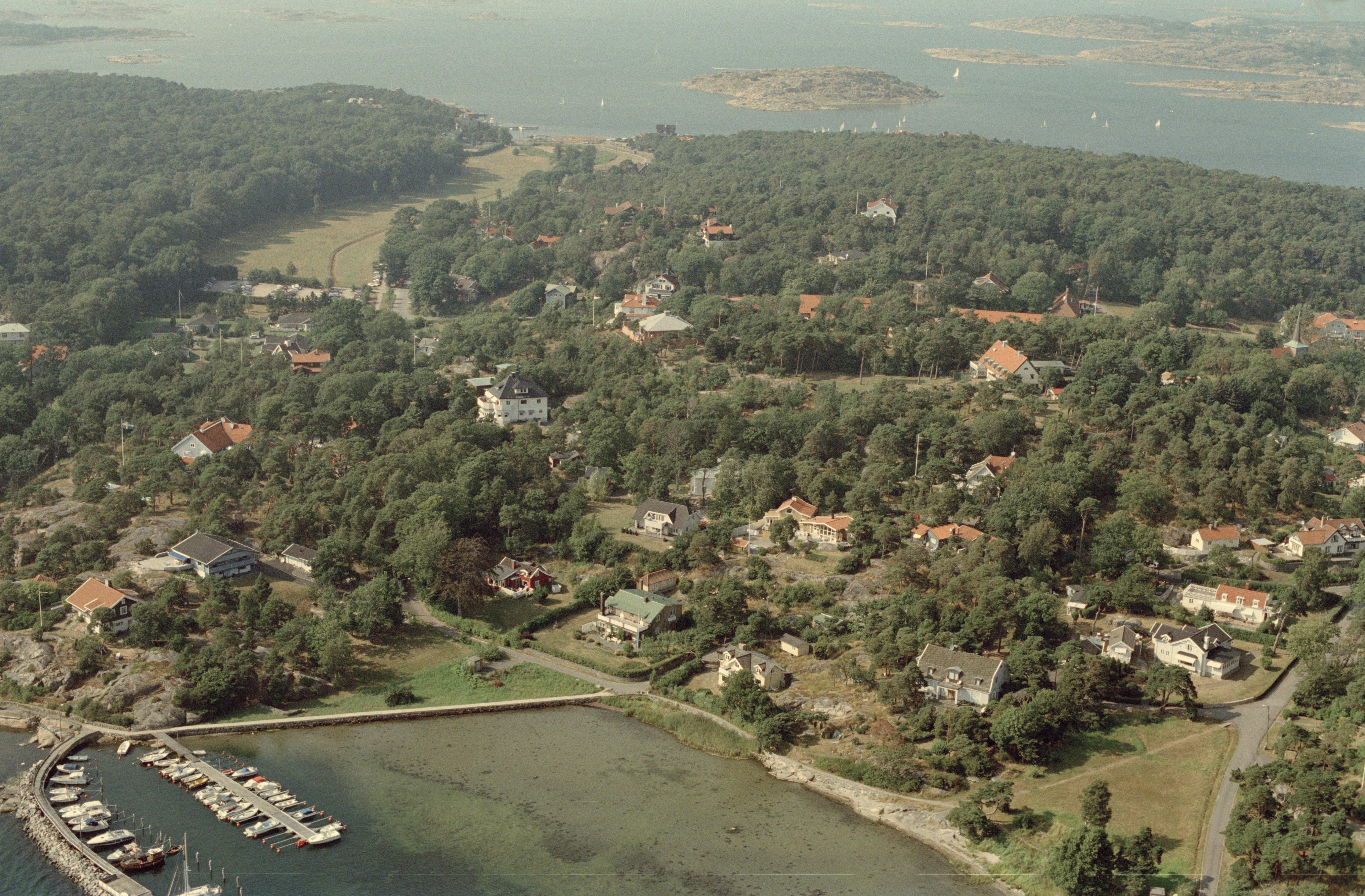 Beskrivning: Särös södra del vid hamnen. Särö kyrka längst till höger om bildens mitt. Bilden är tagen mot (väderstreck): SSO