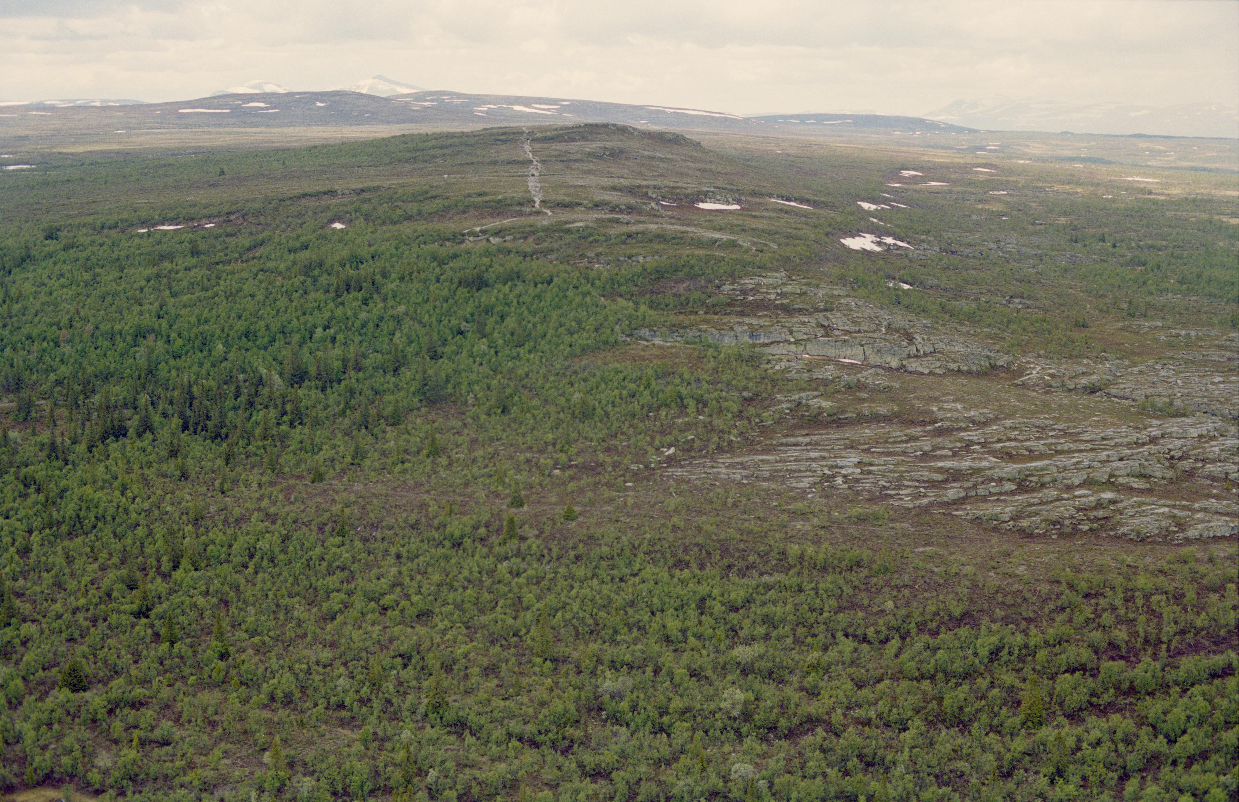 Beskrivning: Östra delen av lågfjället Flatruet (Fleete) vid bergstoppen Ruändan (Sjnjaptjegietije). I bergsidan till höger om bildens mitt en lodrätt klippvägg med hällmålningar RAÄnr Tännäs 58:1. Bilden är tagen mot (väderstreck): NV
