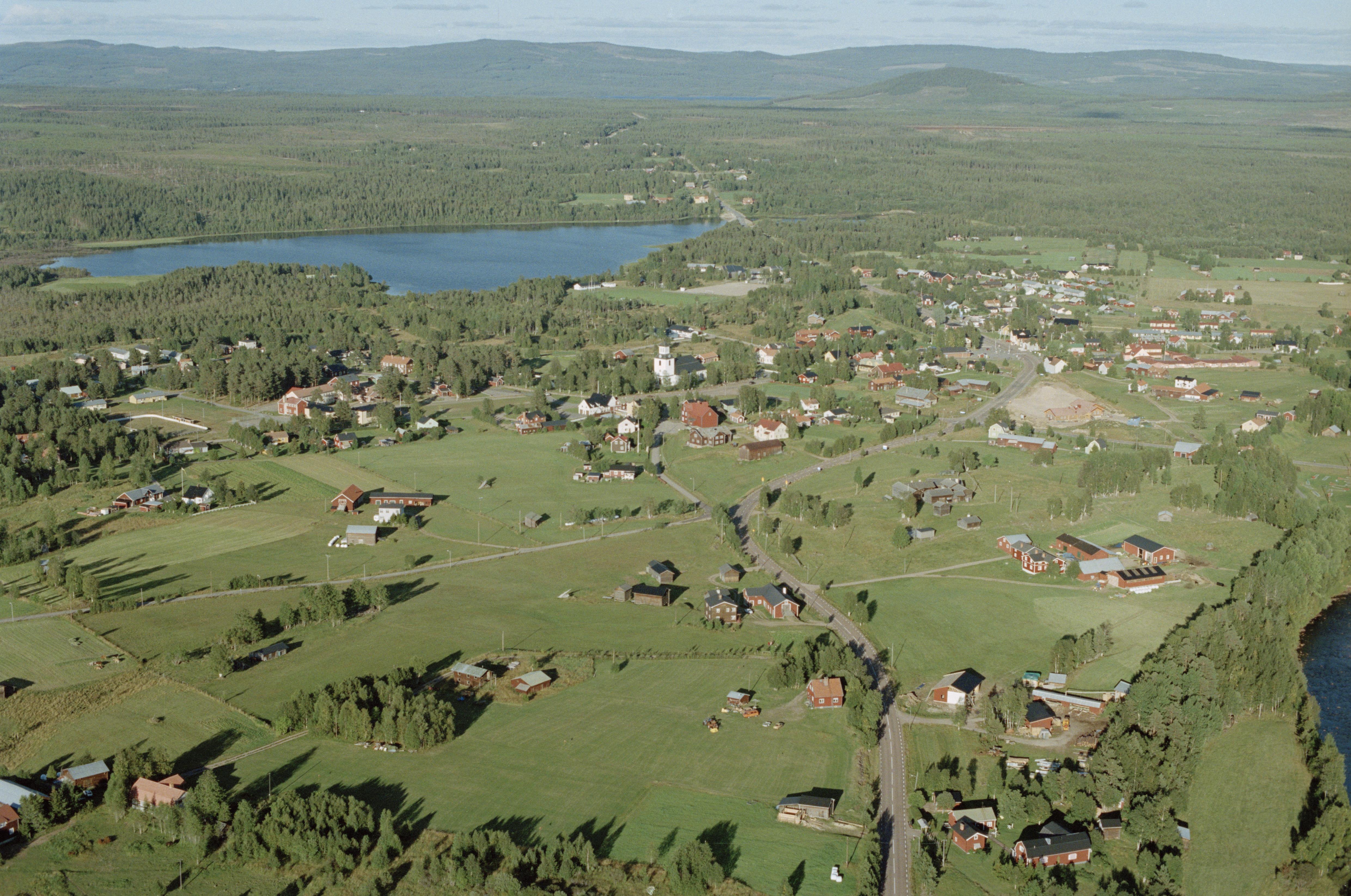 Beskrivning: Lillhärdal tätort och kyrkby vid sjön Hån i Härjeåns dalgång. Lillhärdals kyrka över bildens mitt. Vid kyrkan minnesmärke RAÄnr Lillhärdal 120:1. Bilden är tagen mot (väderstreck): NO