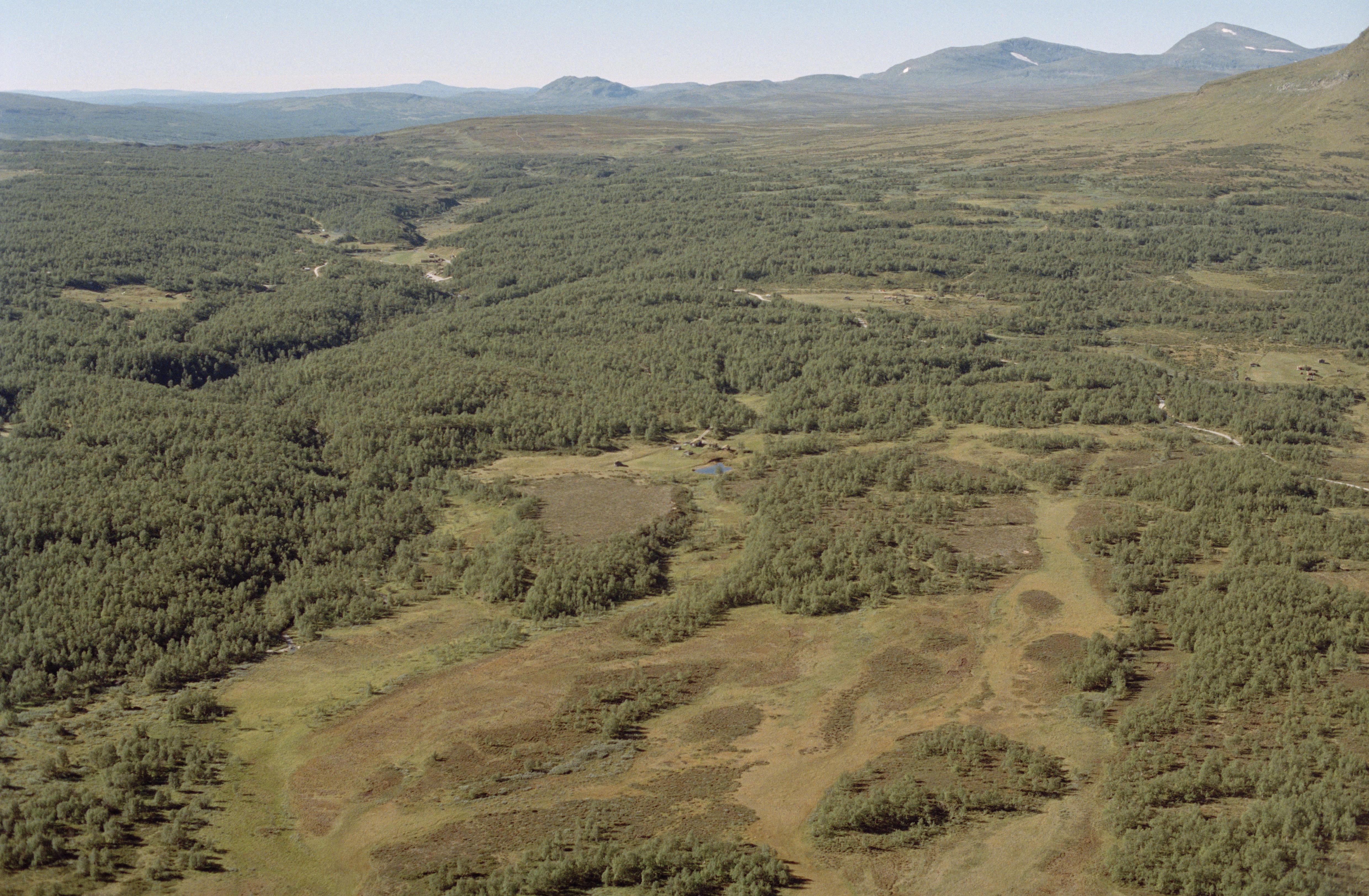 Beskrivning: Under bildens mitt fäbodområdet Storkläppvallen under berget Stor-Mittåkläppen (Kliehpie). Storkläppvallen uppe till höger. I området fångstgropssystem RAÄnr Tännäs 44:1. Bilden är tagen mot (väderstreck): VSV