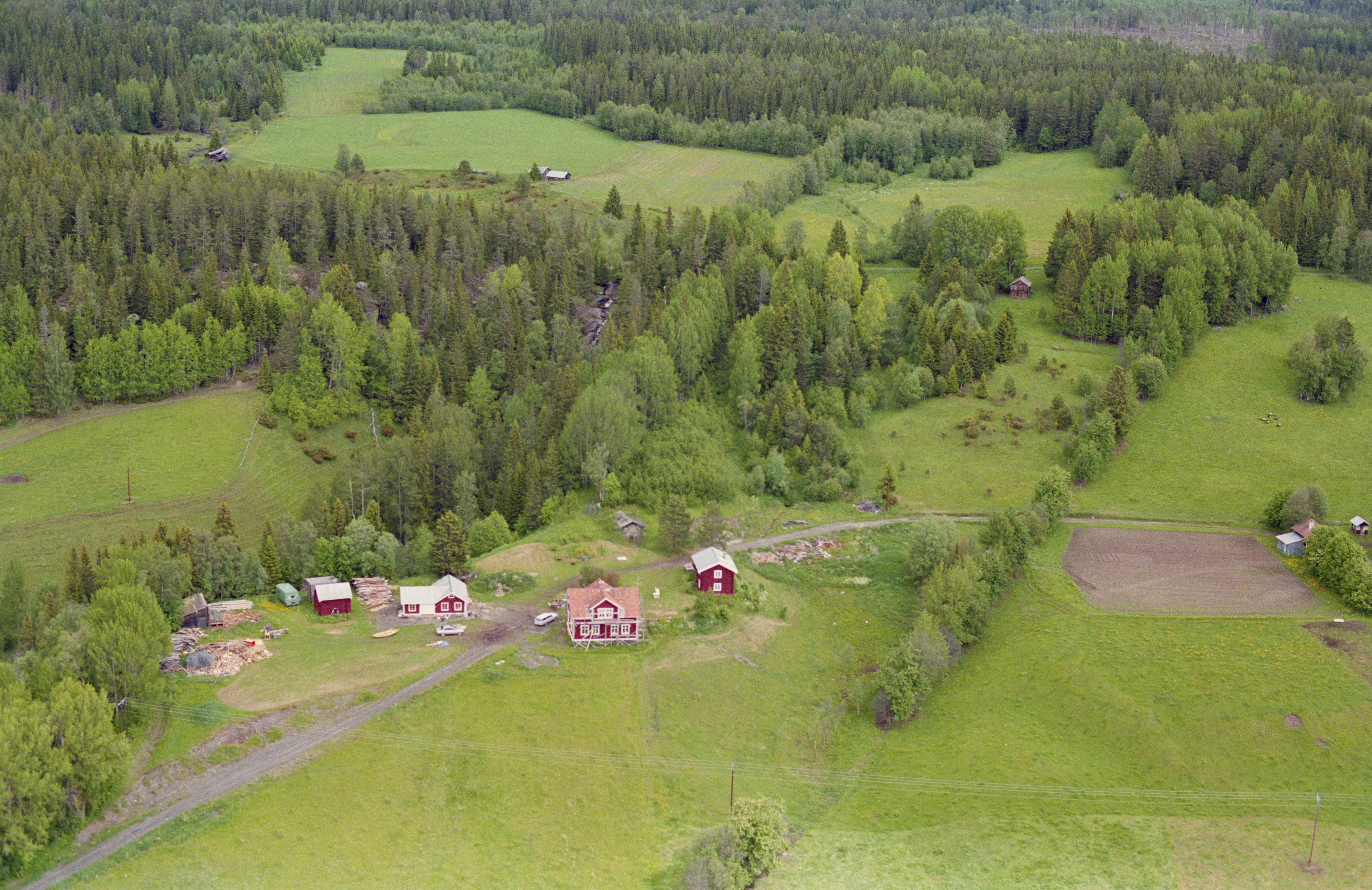 Beskrivning: Glösa by vid pilgrimleden Sankt Olavsleden på nordsidan av Alsensjön. I skogen över bildens mitt Glösaberget med hällristningar RAÄnr Alsen 13:1. Bilden är tagen mot (väderstreck): NNO