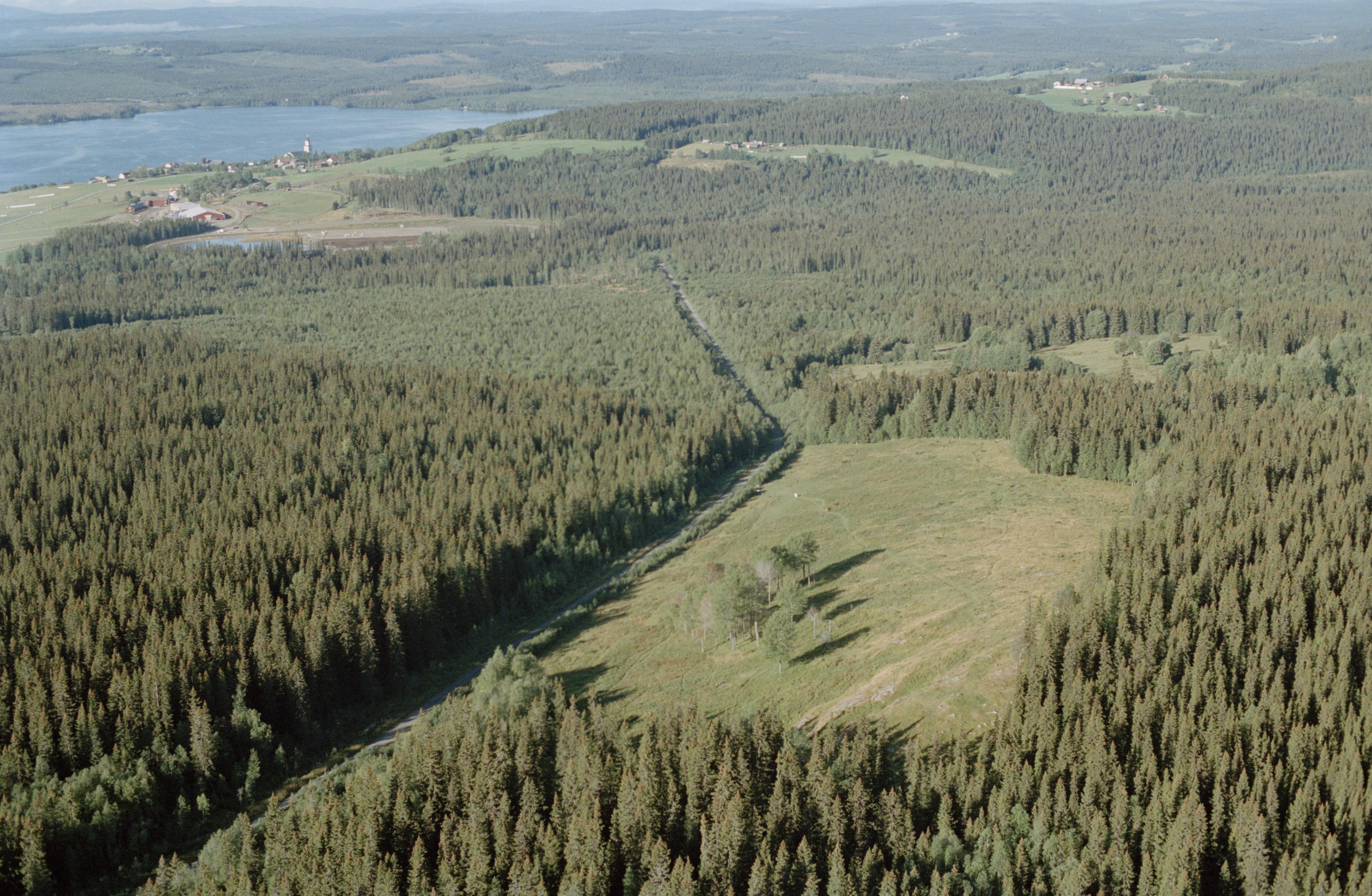 Beskrivning: I bildens nedre del ödesbölet Svedäng med husgrunder och fossila åkrar RAÄnr Alsen 92:1-2, 178:1 och 179:1-2. I bildens övre del Alsens kyrka och kyrkby vid Alsensjön. Bilden är tagen mot (väderstreck): V