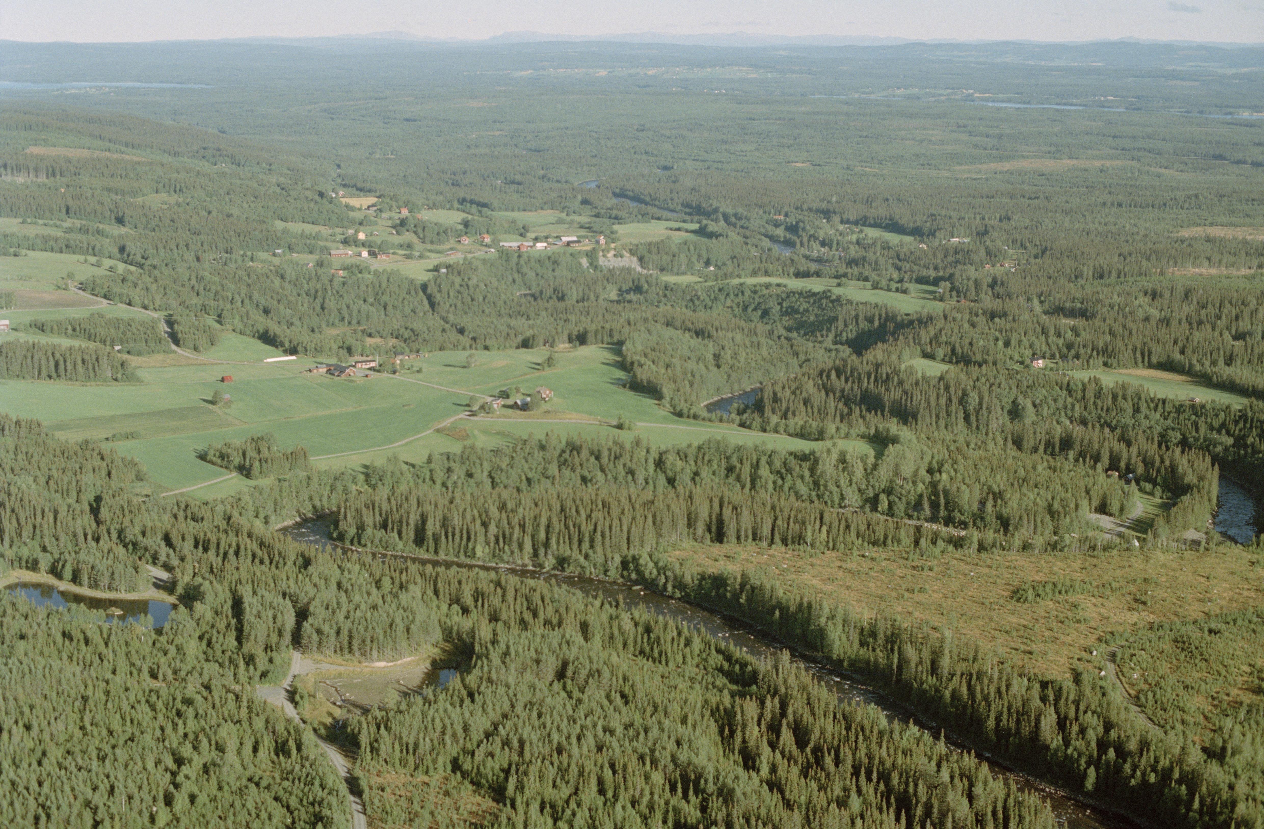 Beskrivning: Dammåns dalgång. Vid bildens mitt byn Hallbrännan. Över bildens mitt byarna Ån, Ågårdarna och Böle. Under bildens mitt lämningar efter flottningsanläggning RAÄnr Hallen 332 och 336. Bilden är tagen mot (väderstreck): N