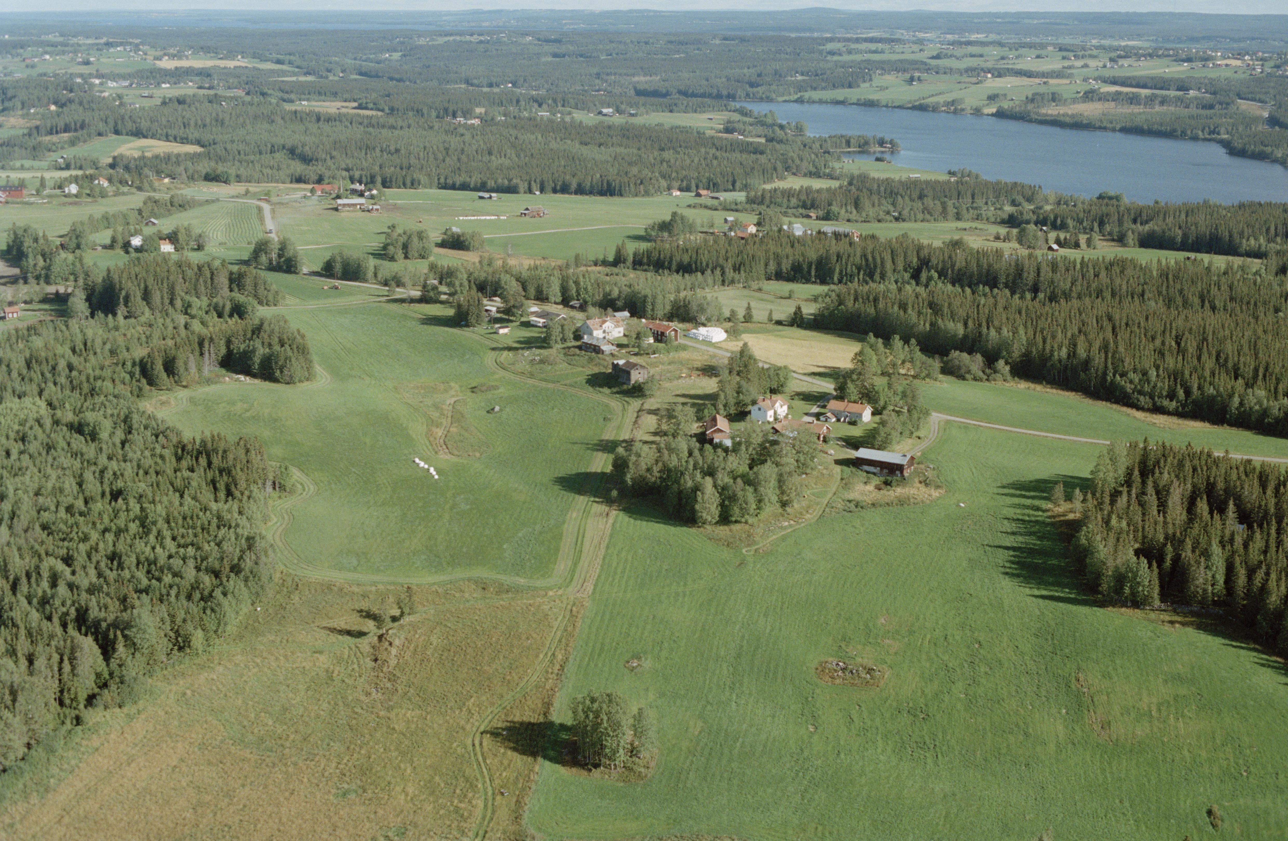 Beskrivning: Hällne by vid Myrviken i Storsjön. Området Klockarbacken i bildens nedre del. Till vänster över bildens mitt Hällneborgs kyrka RAÄnr Oviken 542 och 545 m.m. Vid bildens mitt bytomt RAÄnr Oviken 544. Bilden är tagen mot (väderstreck): NO