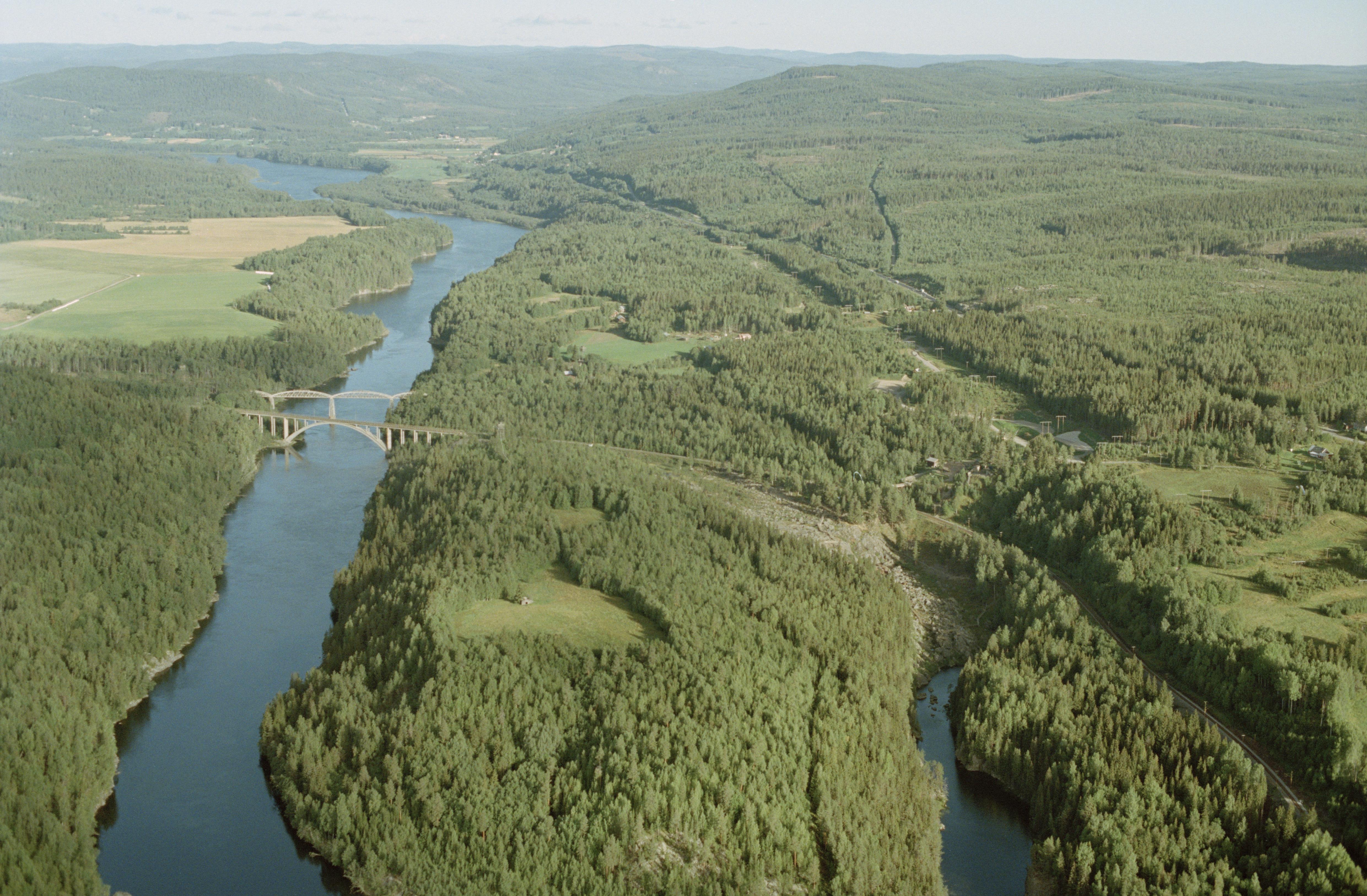 Beskrivning: Indalsälven i bildens vänstra del. Till höger naturreservatet Döda fallet (ett vattenfall som blev torrlagd vid tömning av Ragundasjön år 1796). Vid Döda fallet ett minnesmärke RAÄnr Ragunda 385:1, ett gruvhål Ragunda 387:1 m.m. Gränsen mot Fors socken i bildens högra kant. Bilden är tagen mot (väderstreck): NV