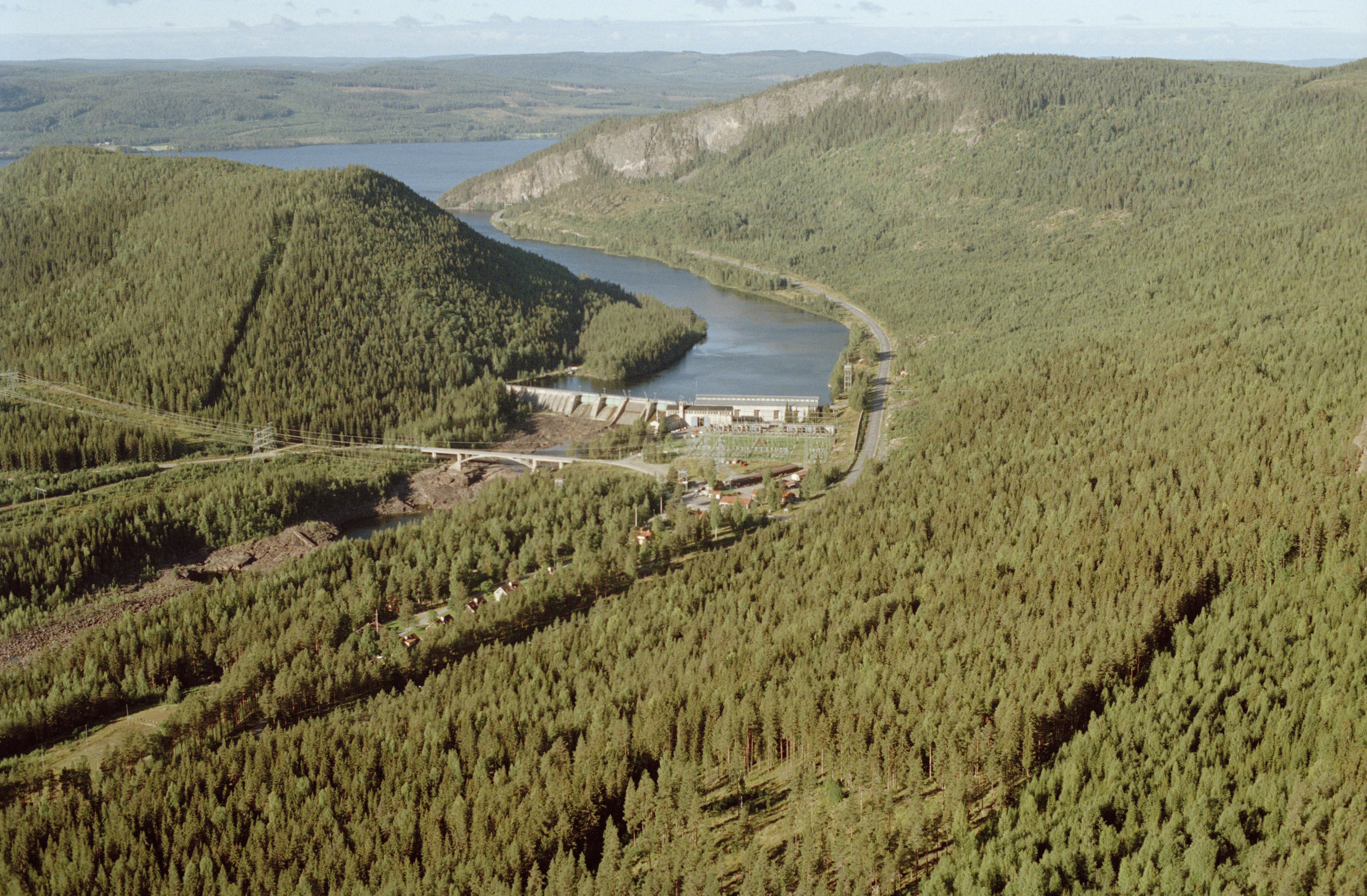 Beskrivning: Området Krångede i Indalsälvens dalgång. Forsberget uppe till vänster och Stadsberget till höger. Krångede kraftverk vid bildens mitt. Vid kraftverket ett vägmärke RAÄnr Ragunda 374:1 och ett minnesmärke Ragunda 374:1. Bilden är tagen mot (väderstreck): V