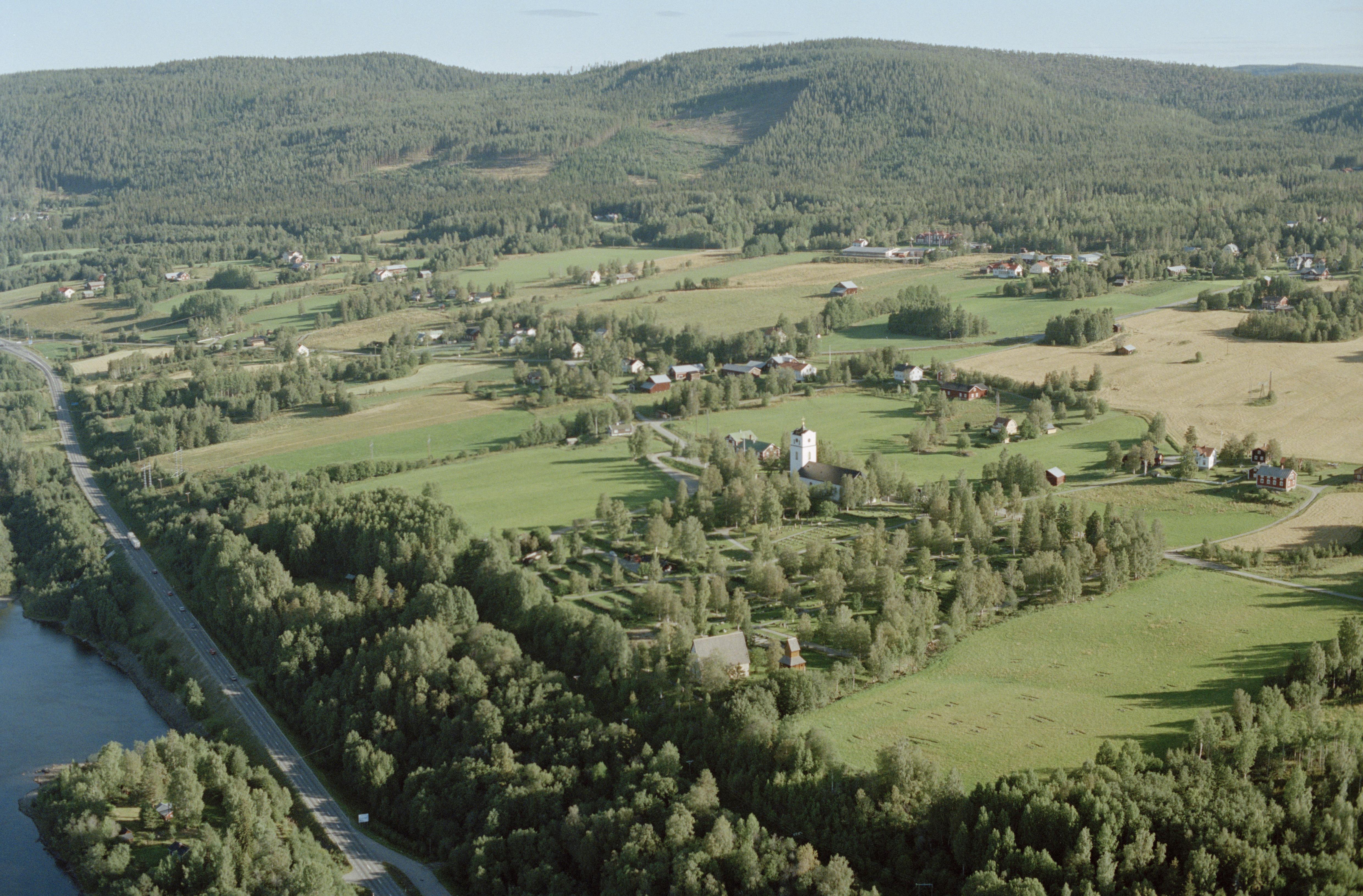 Beskrivning: Ragunda kyrkby vid Indalsälven. Ragunda gamla kyrka vid boplats RAÄnr Ragunda 65:1 under bildens mitt. Ragunda (nya) kyrka till höger om bildens mitt. Bilden är tagen mot (väderstreck): NO