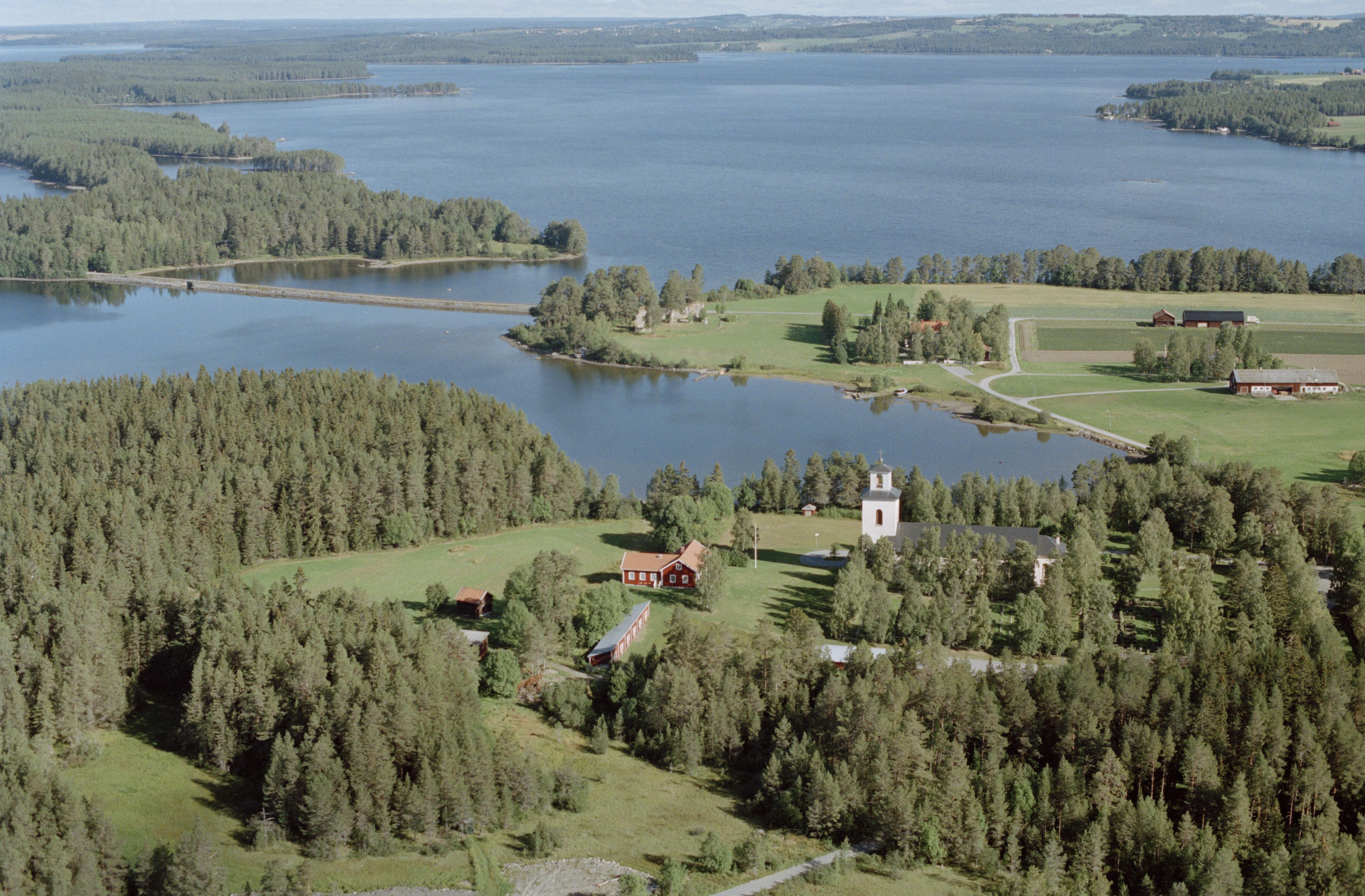 Beskrivning: Sunne kyrkby vid Storsjön. Sunne kyrka till höger under bildens mitt. På udden till höger över bildens mitt kyrko- och kastalruin RAÄnr Sunne 2:1-3 m.m. Uppe till vänster Skansholmen med Andersö skans RAÄnr Sunne 19:1 m.m. Bilden är tagen mot (väderstreck): NO