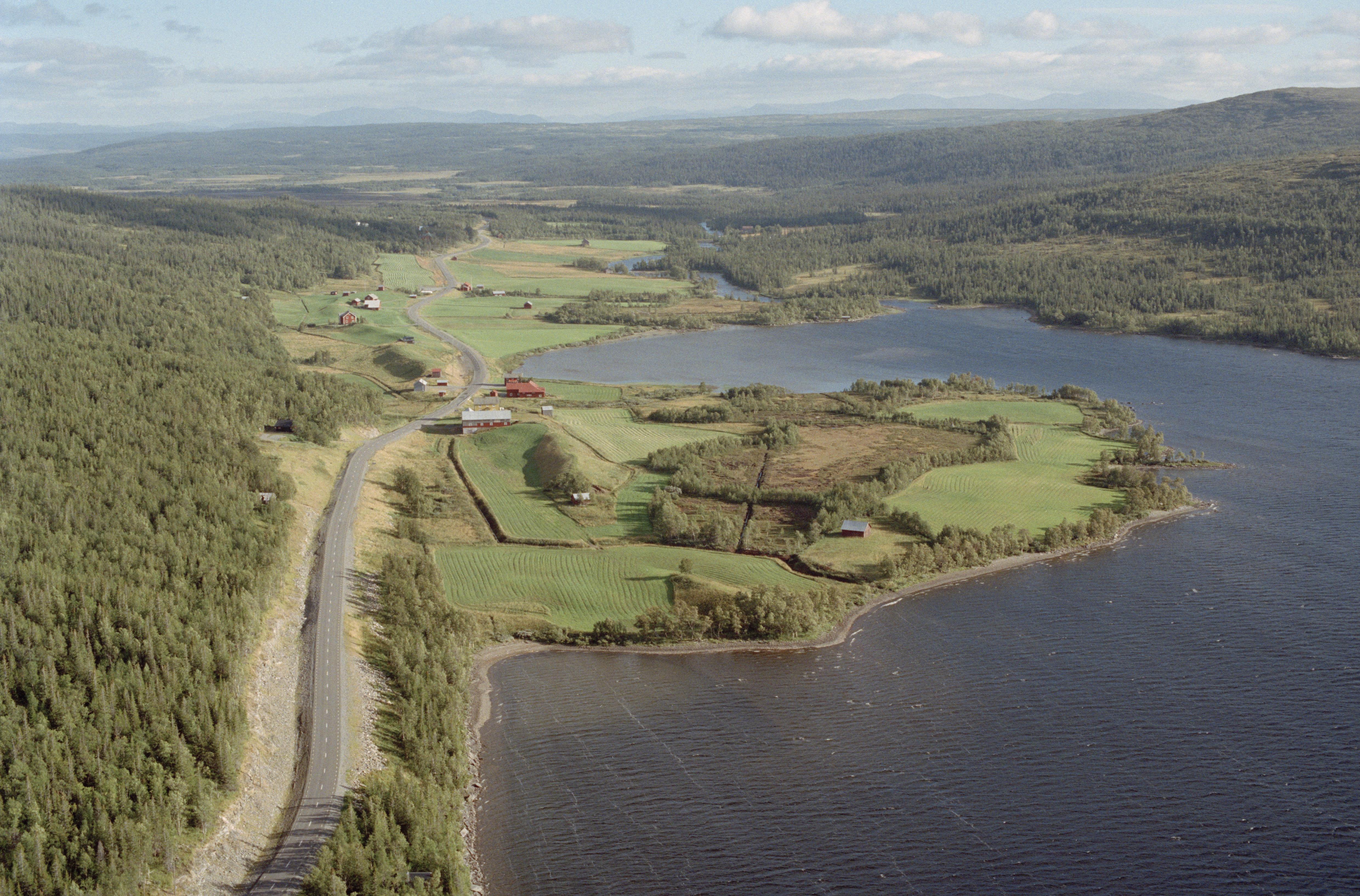 Beskrivning: Skalstugevägen och pilgrimsleden Sankt Olavsleden vid Medstugan och Medstugusjön. Näsudden vid bildens mitt. Över bildens mitt bro RAÄnr Åre 463:1 över Medstugeån. Bilden är tagen mot (väderstreck): SO