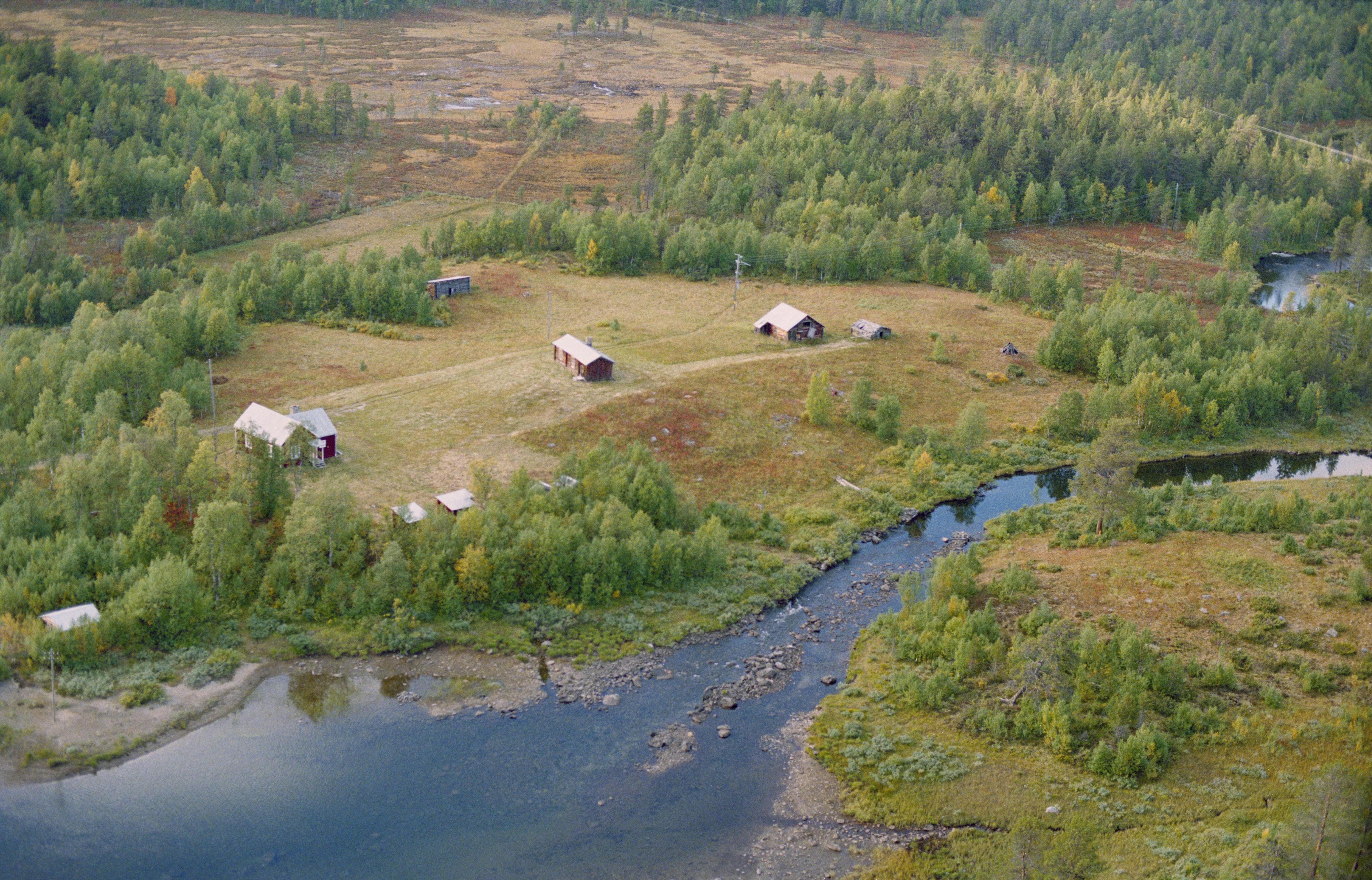 Beskrivning: Området Viejenäs i östra ändan av Gautosjön (Gávttojávrre / Gautojaure) i dalgången Laisälven (Lájsso). Vid bildens mitt boplatser RAÄnr Arjeplog 559:1 och 560:1. Ån Viejeströmmen med fångstgrop RAÄnr Arjeplog 964:1 till höger. Bilden är tagen mot (väderstreck): VNV