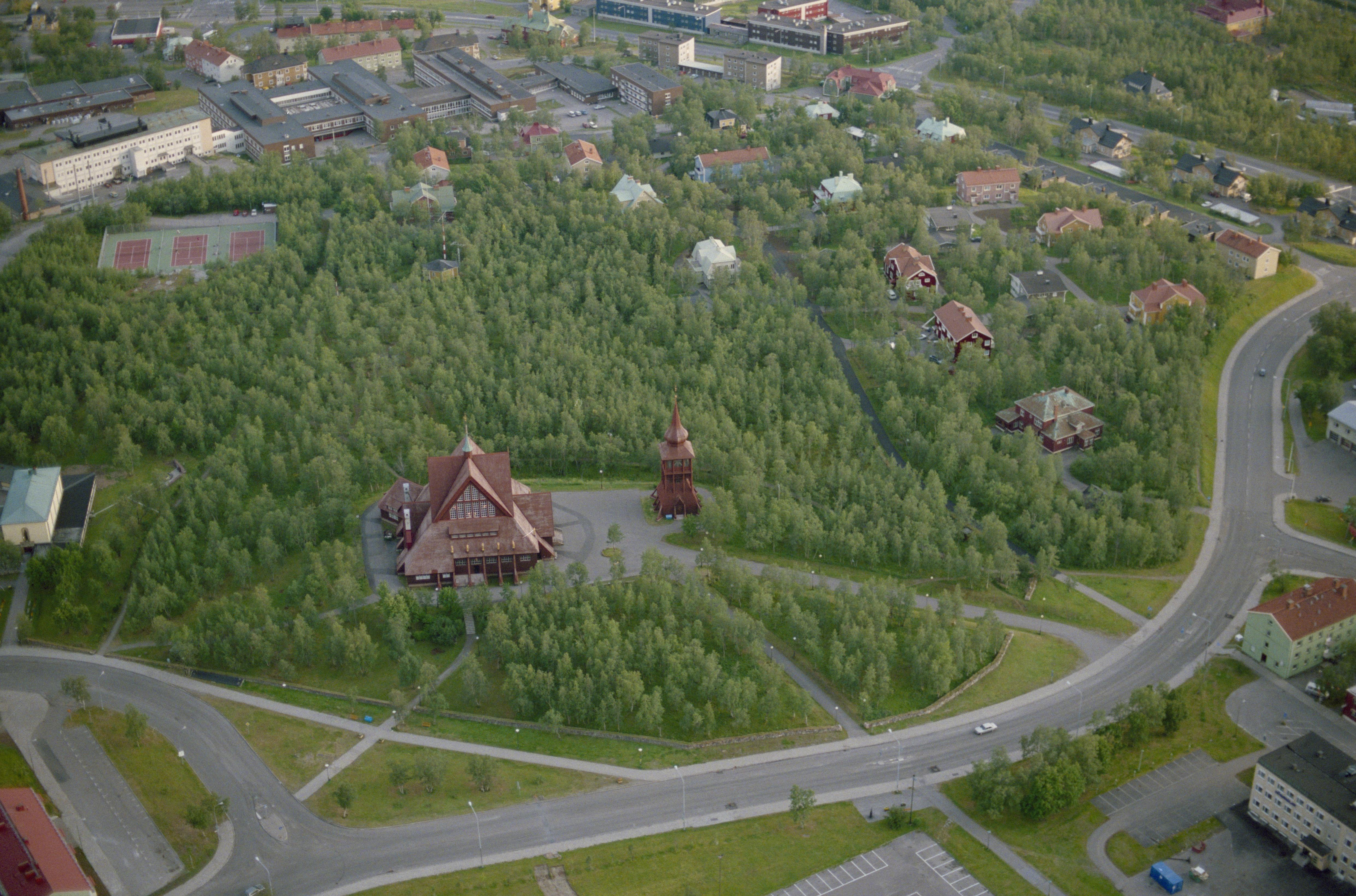 Beskrivning: Kiruna (Giron) tätort och gruvsamhälle. Till vänster under bildens mitt Kiruna kyrka. I skogen vid bildens mitt minnesmärke RAÄnr Jukkasjärvi 159:1. (Området var tidigare i f.d. socknet Kiruna stad, men är nu i Jukkasjärvi socken). Bilden är tagen mot (väderstreck): S