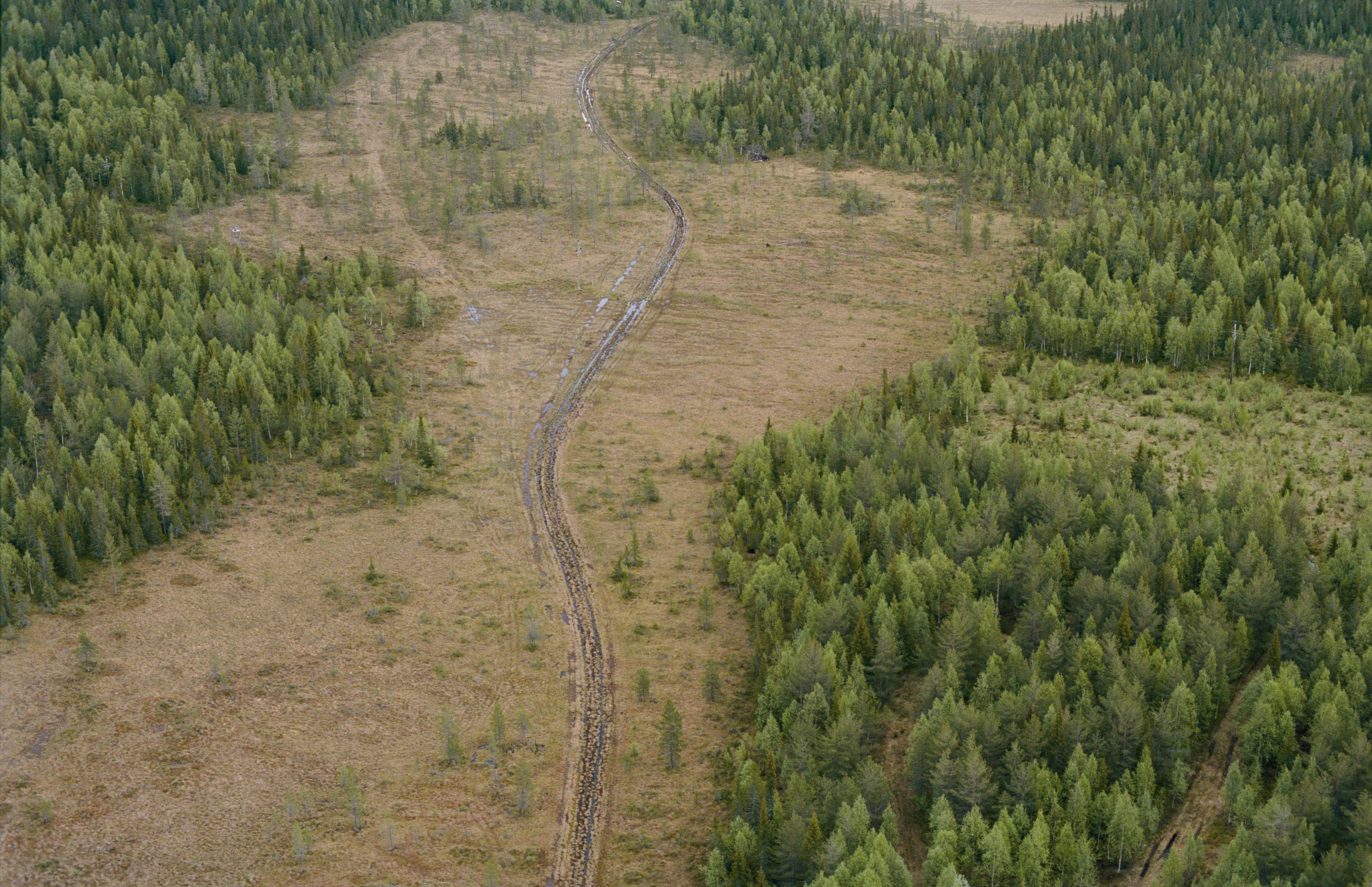 Beskrivning: Spår med terrängfordon på Tjärnmyran, söder om Fäbodlidens by. Bilden är tagen mot (väderstreck): Ö