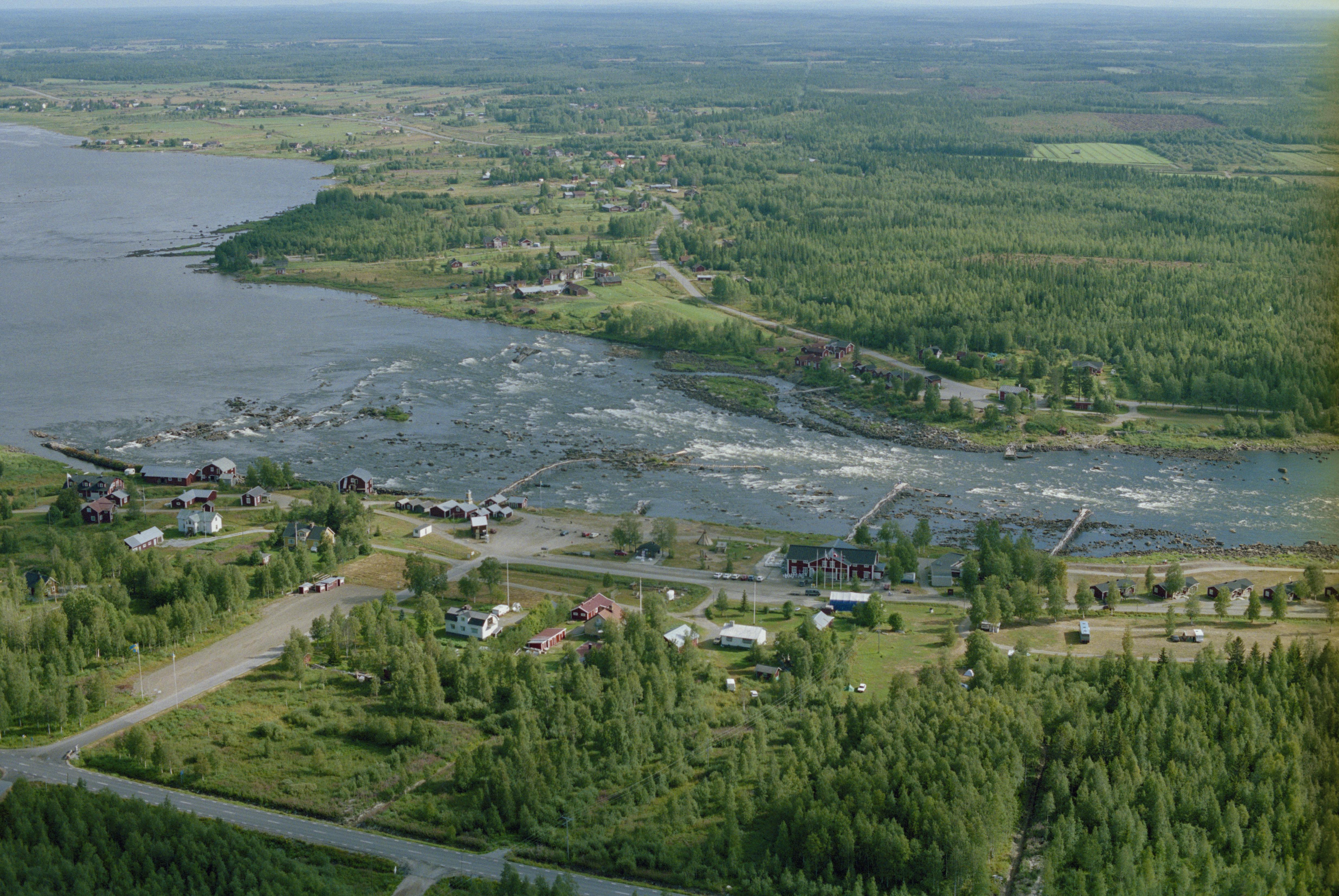 Beskrivning: Kukkola (Koskenpää) by i Tornedalen. Riksgränsen mot Finland över bildens mitt. Längs bildens mitt Kukkolaforsen i Torneälven. Till vänster under bildens mitt kalkugn RAÄnr Karl Gustav 182:1. Bilden är tagen mot (väderstreck): NO