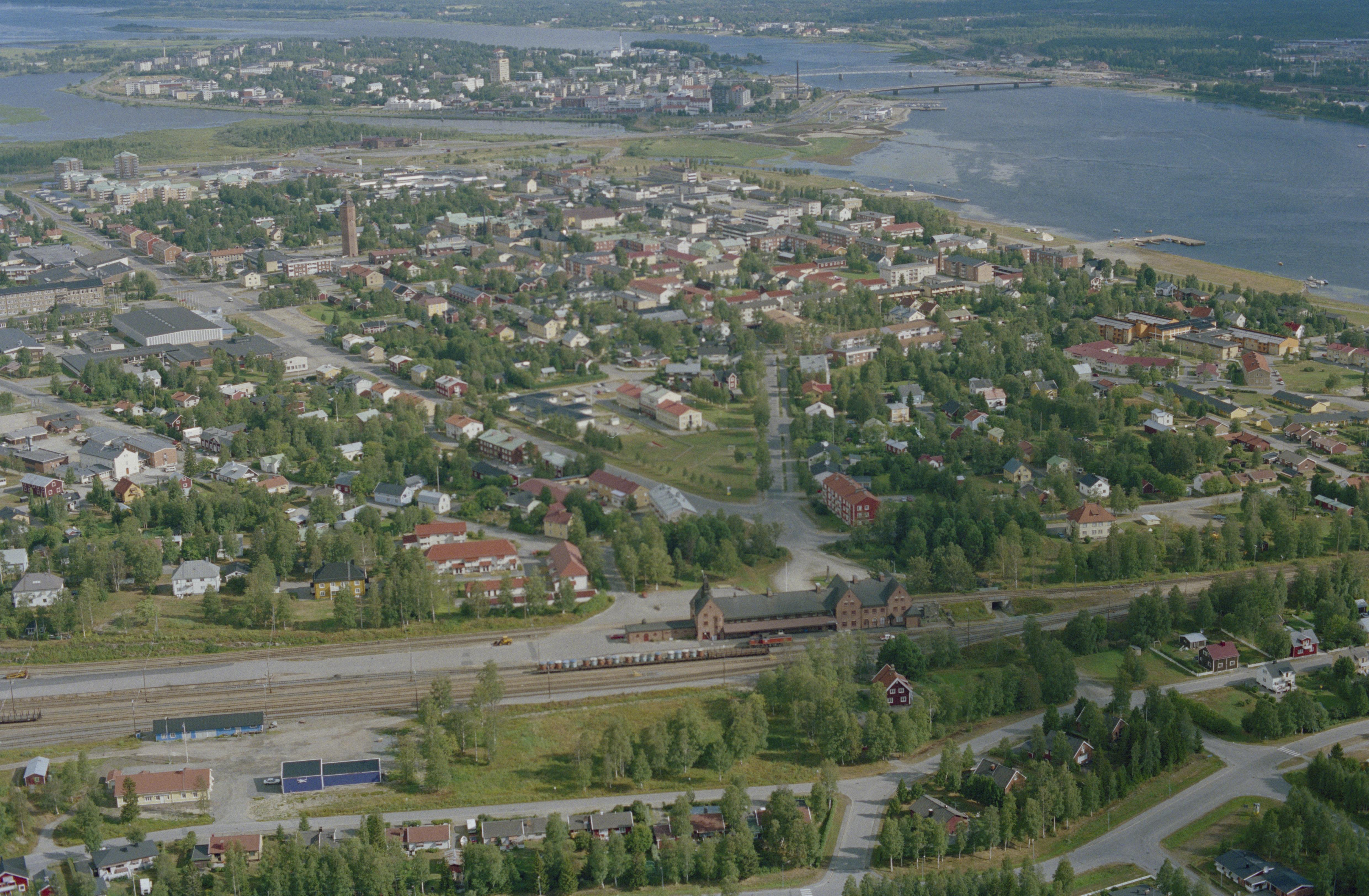 Beskrivning: Haparanda (Haaparanta) stad / tätort (i f.d. Haparanda socken) vid Torneälvens mynning i Bottenviken och riksgränsen mot Finland i öst. Haparanda järnvägsstation i bildens nedre del. Till vänster över bildens mitt Torget med minnesmärke RAÄnr Nedertorneå 156:1. Bilden är tagen mot (väderstreck): NNO