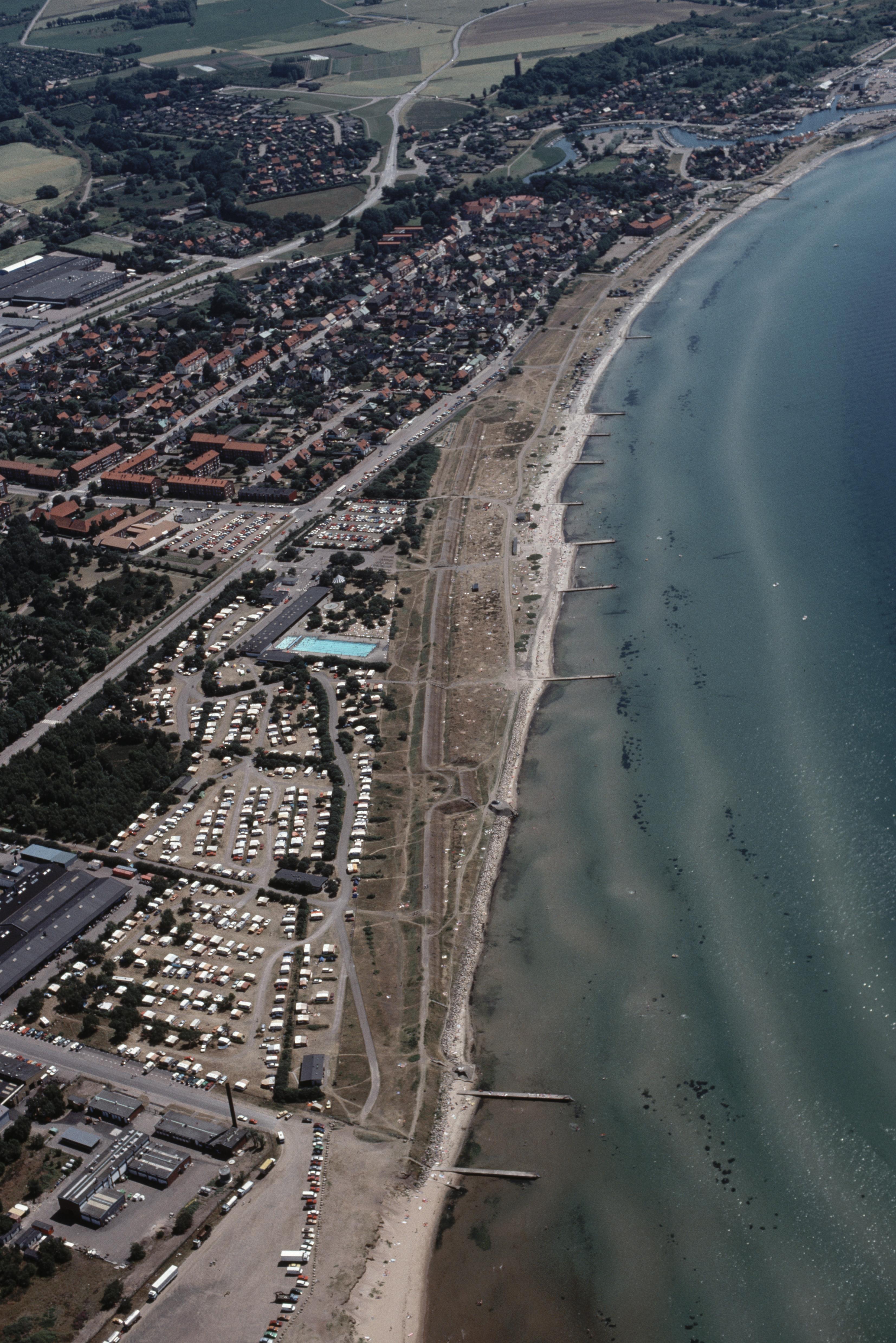 Beskrivning: (Tidigare Raus socken). Campingplats, badplats. Råå vallar RAÄnr Helsingborg 92:1 vid stranden. I bildens övre del Råå-åns utflöde i Öresund. Bilden är tagen mot (väderstreck): SSO