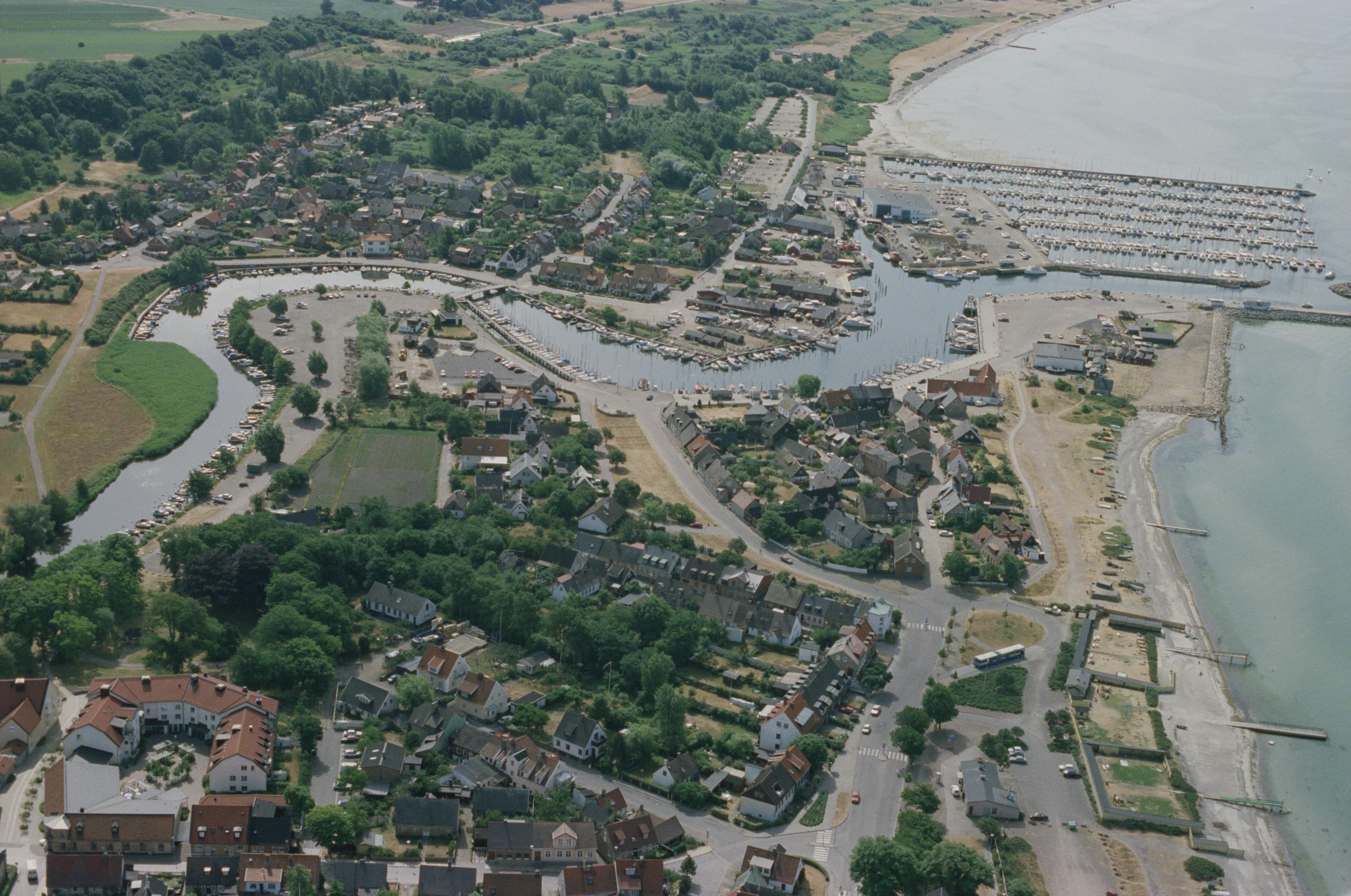 Beskrivning: (Tidigare Raus socken). Råå hamn med Råå-åns utflöde i Öresund. Bilden är tagen mot (väderstreck): S